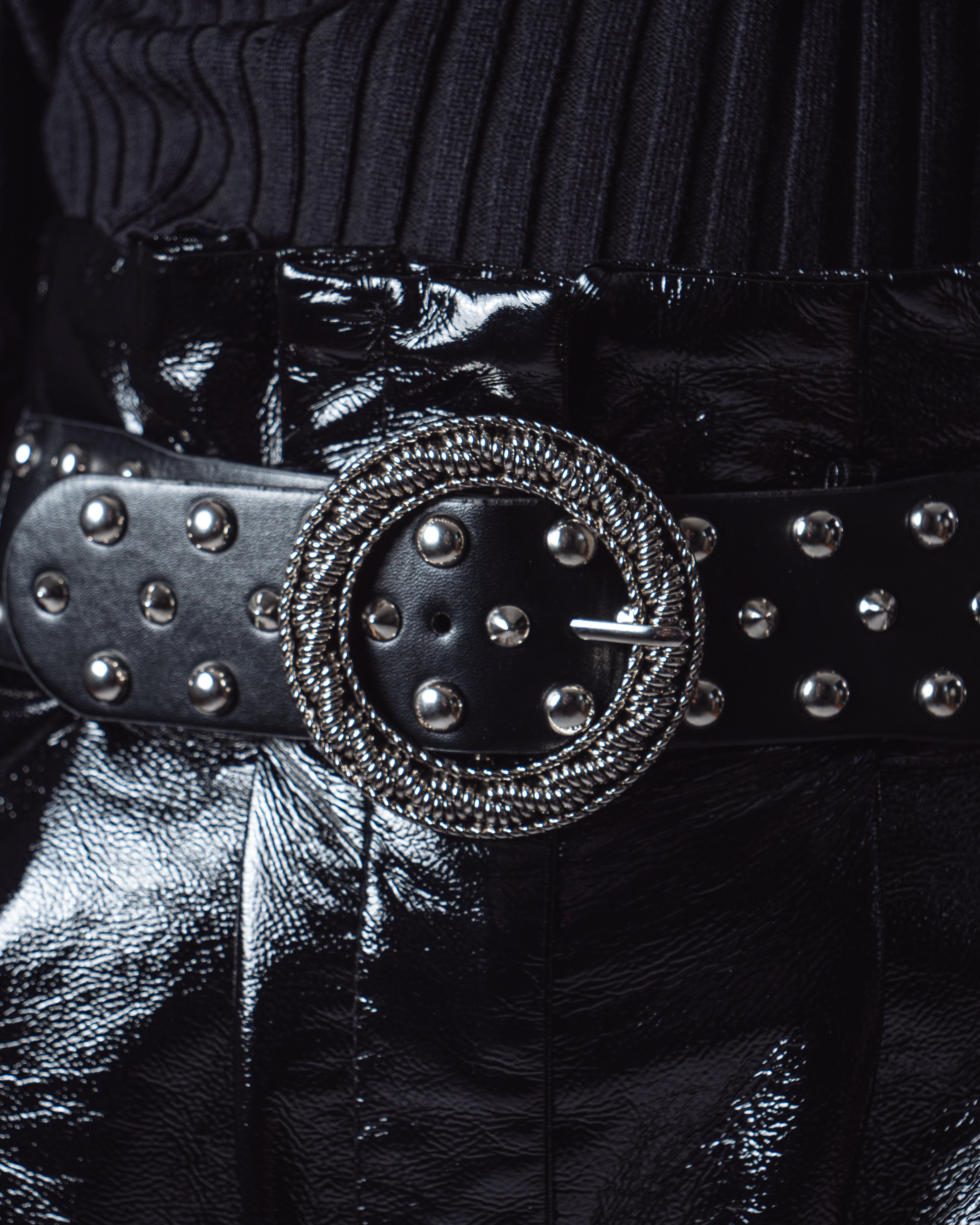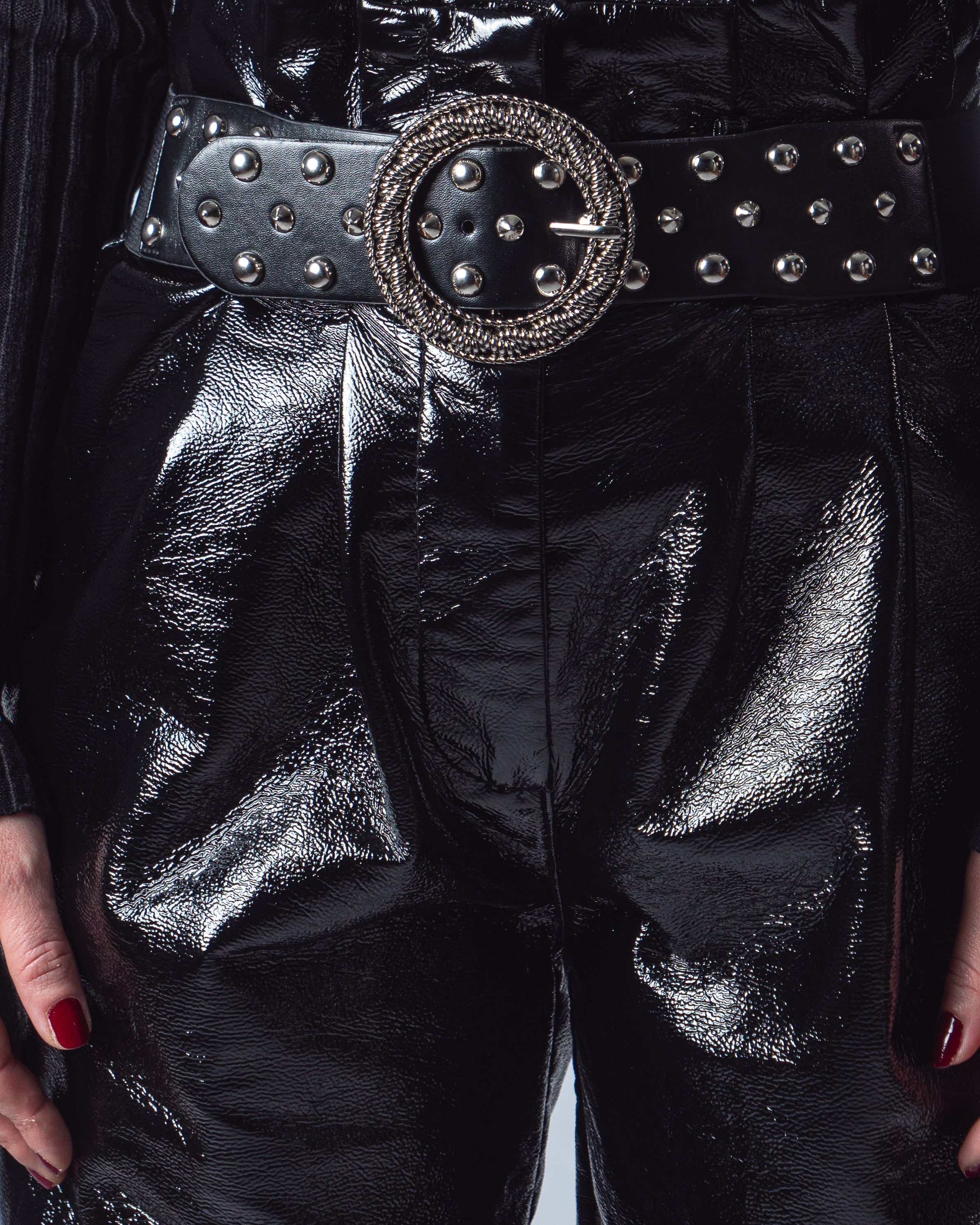 Cintura nera larga 4,5 cm realizzata in pelle sintetica. Dettaglio :borchie e fibbia metallica tonda,elasticizzata.