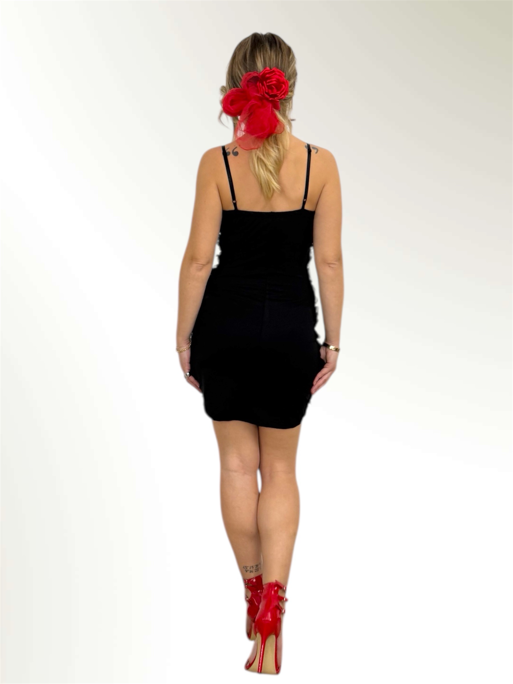 Abito corto e aderente tempestato di rose con spalline regolabili.Elasticizzato sul retro.