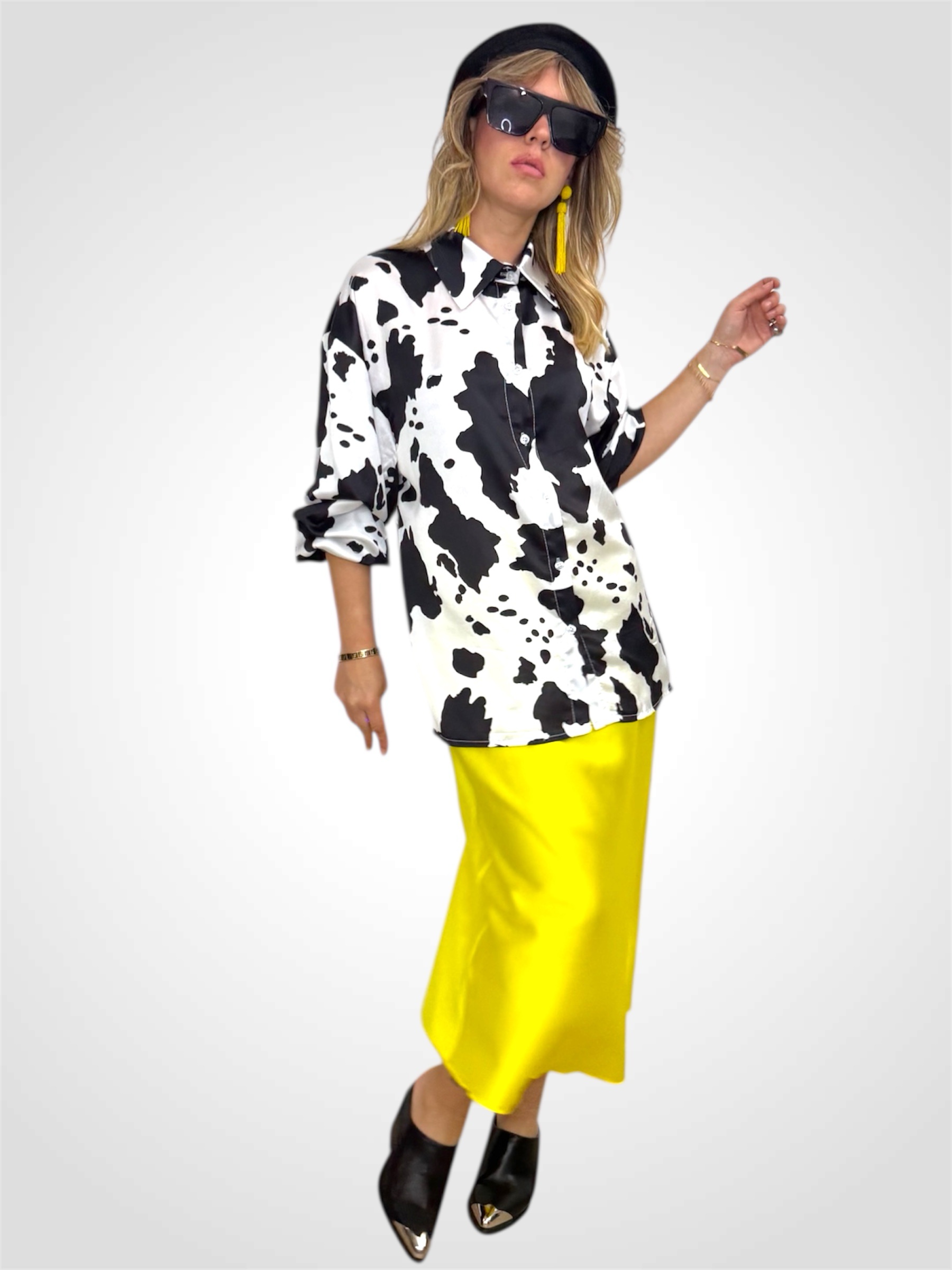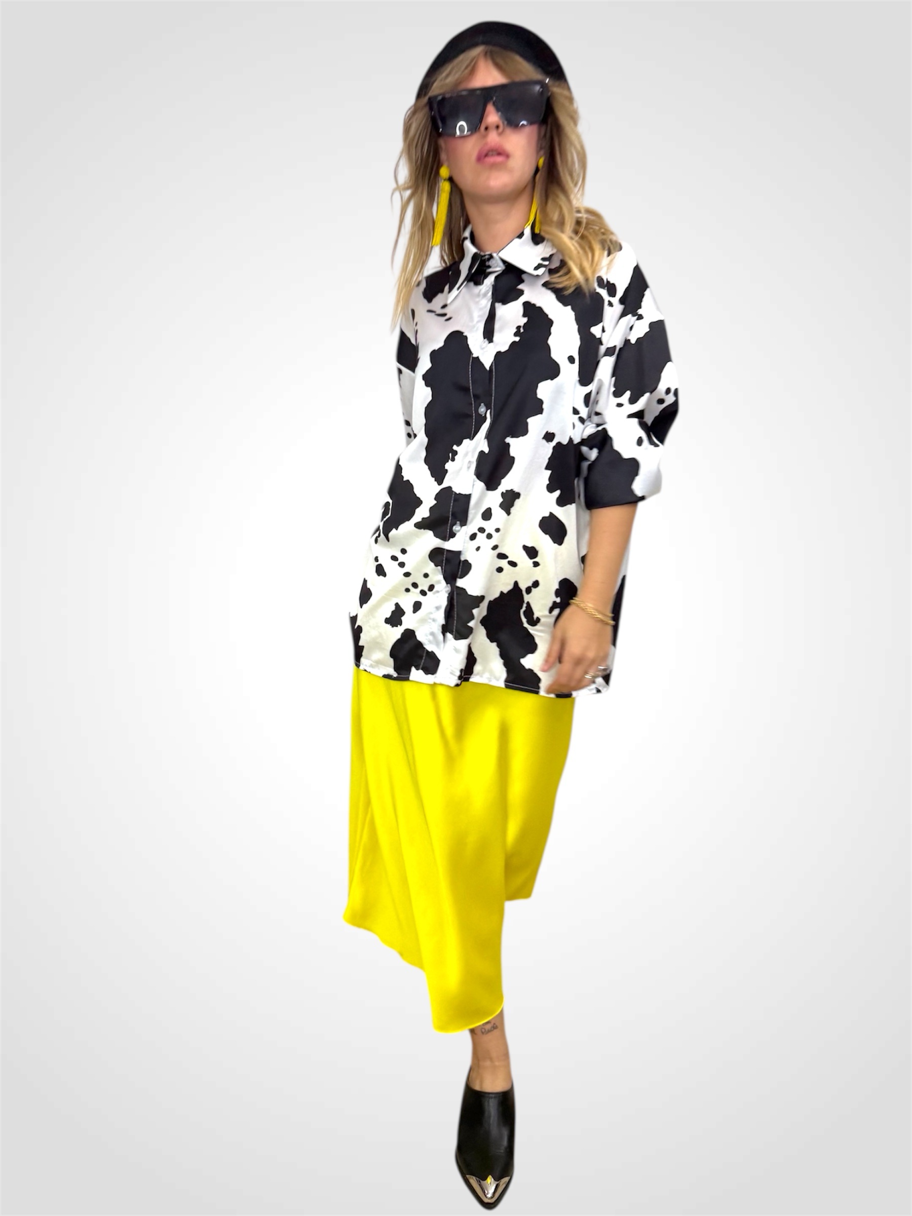 Camicia over con stampa “muccata” in satin.Veste morbido.