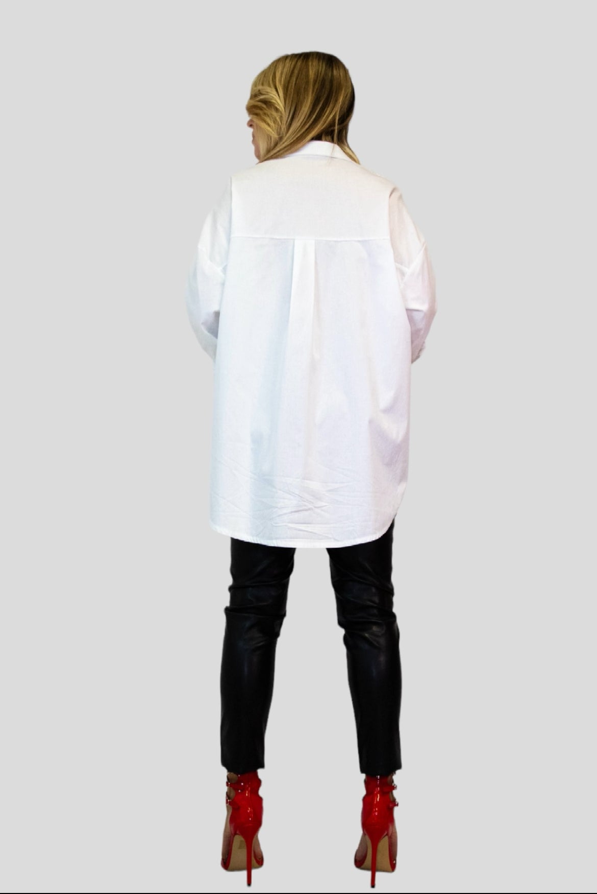 Camicia oversize 100% cotone. Colletto e maniche lunghe con polsino. Dettaglio di spacchi laterali e chiusura frontale con bottoni.