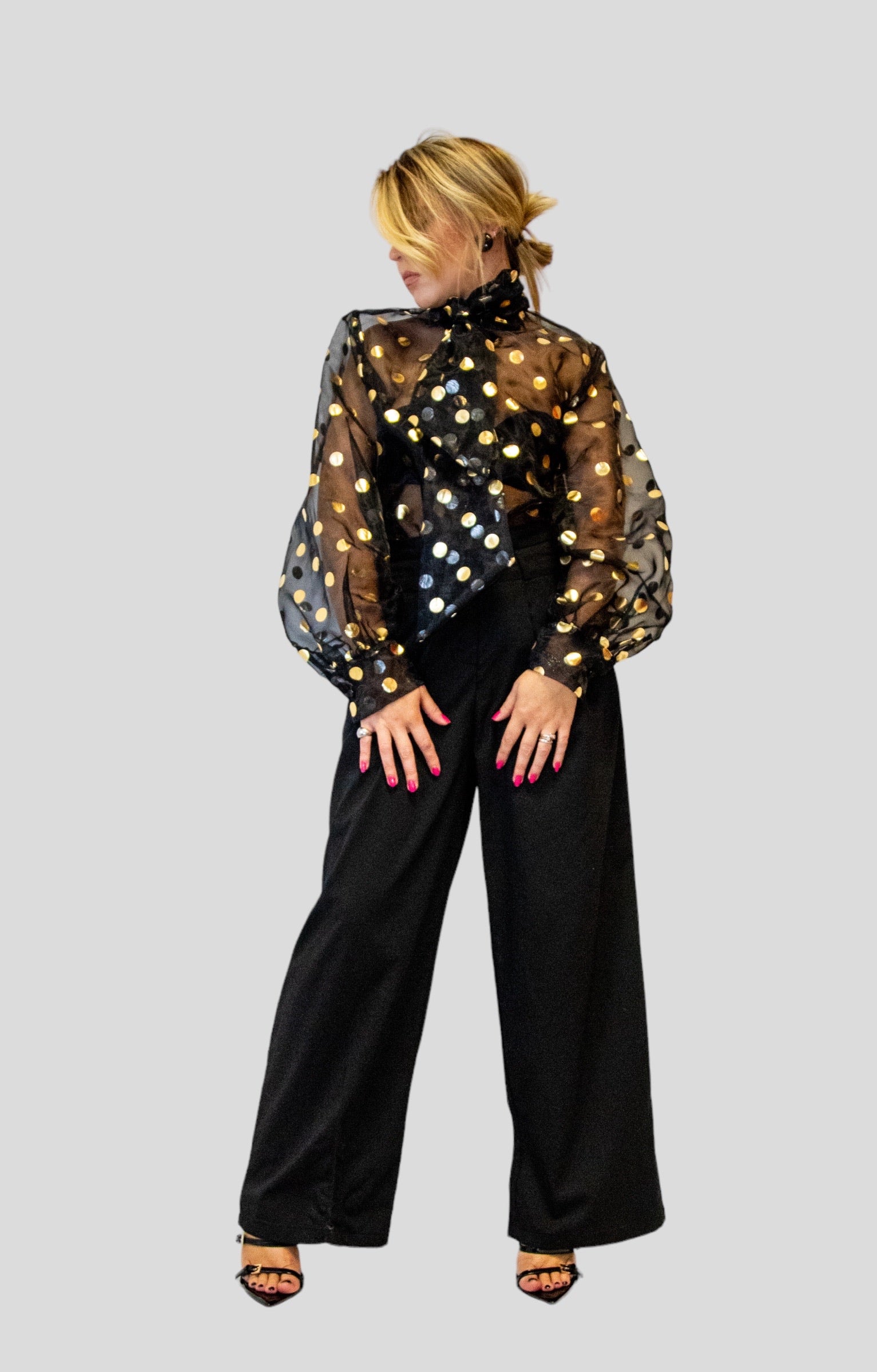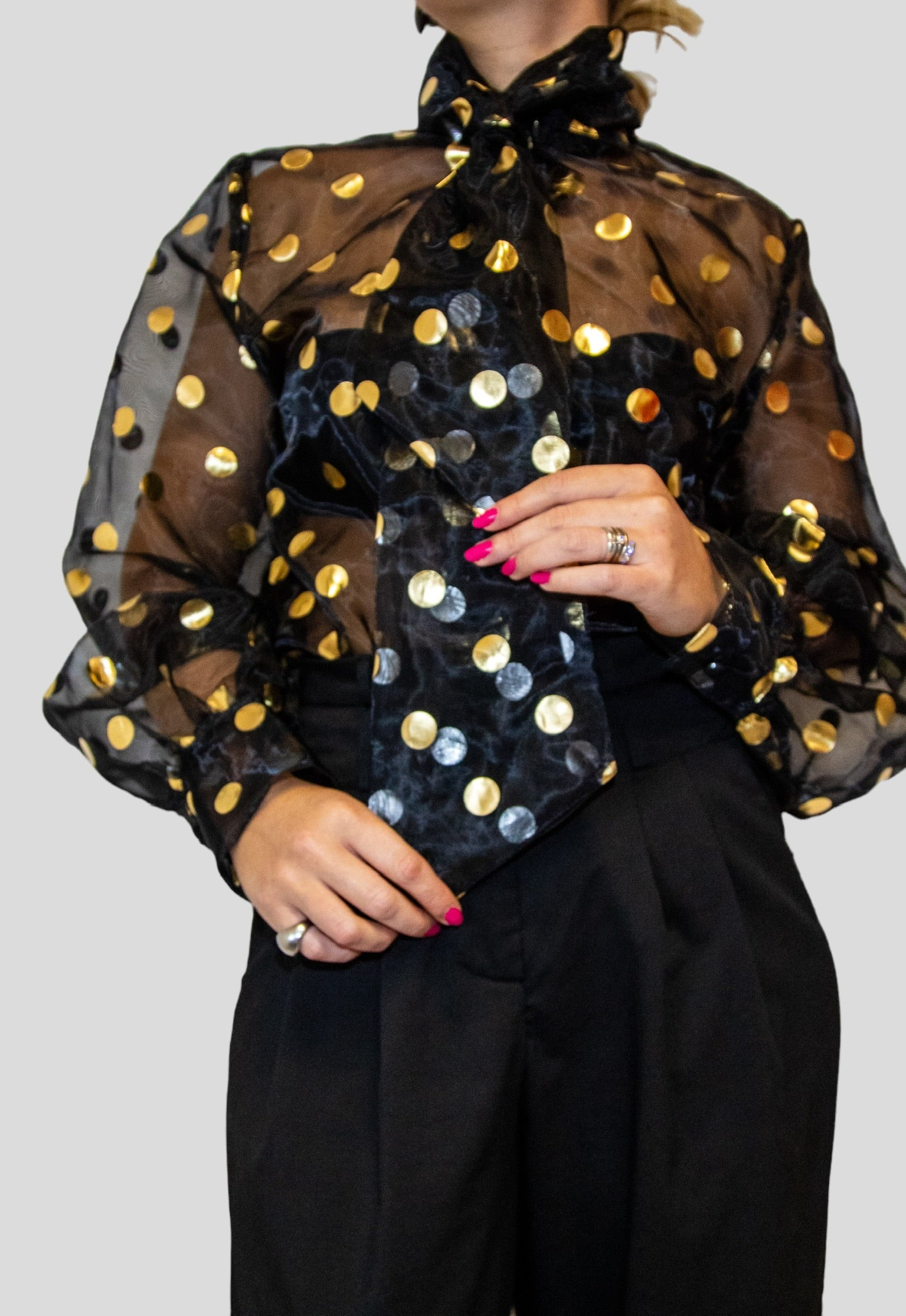 Camicia in Chiffon trasparente con dettaglio pois stampati oro,chiusura con bottoni e cravatta/fiocco.