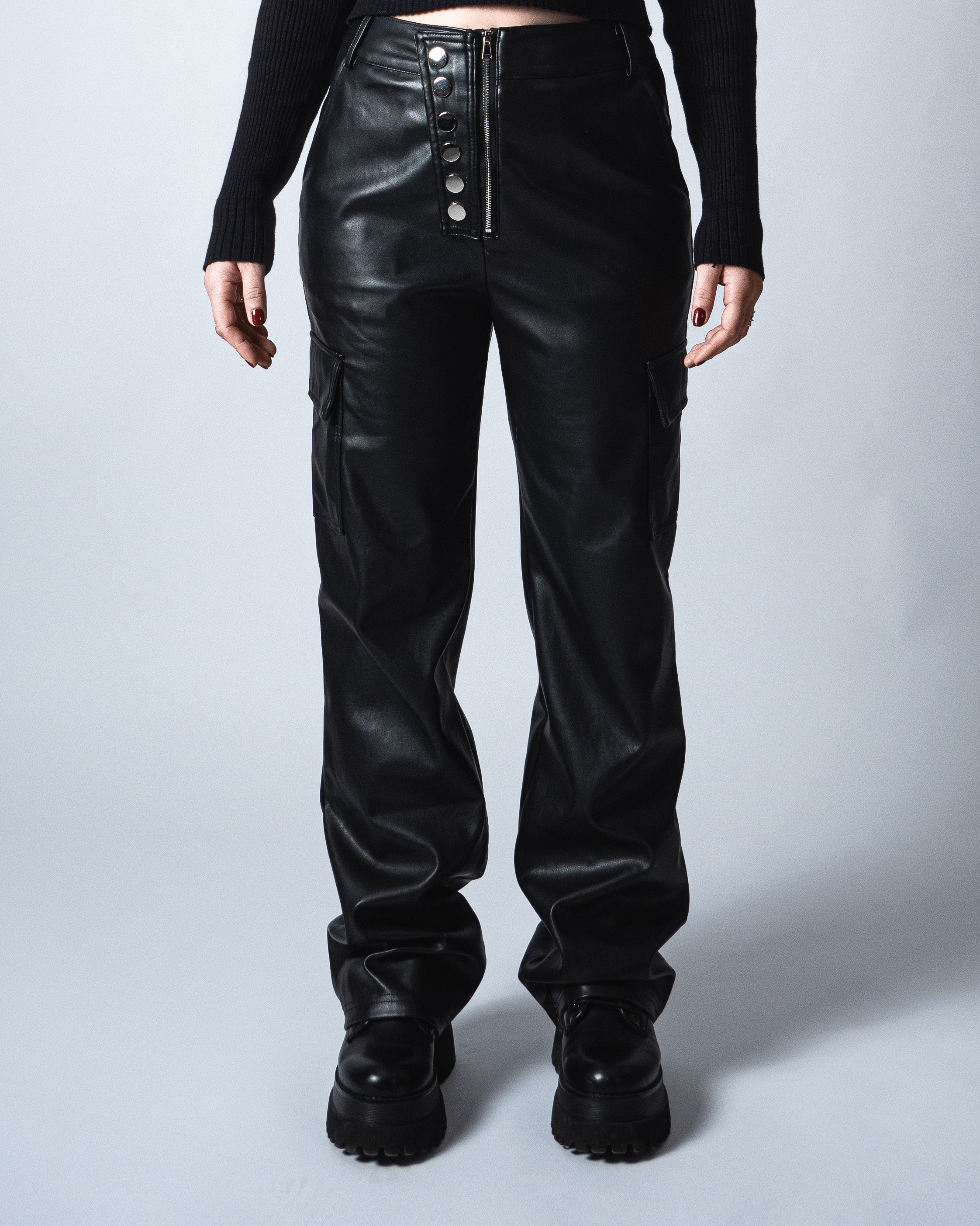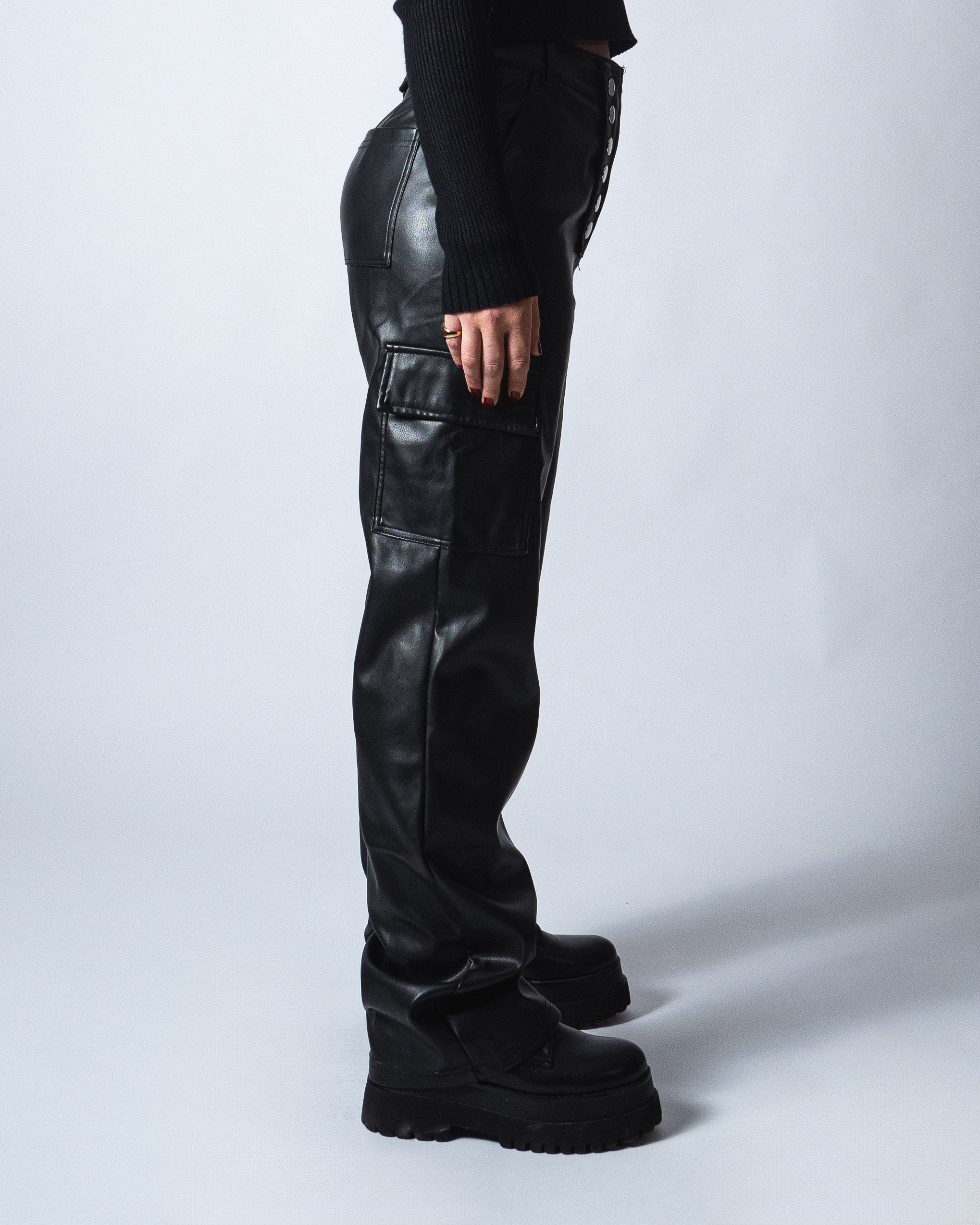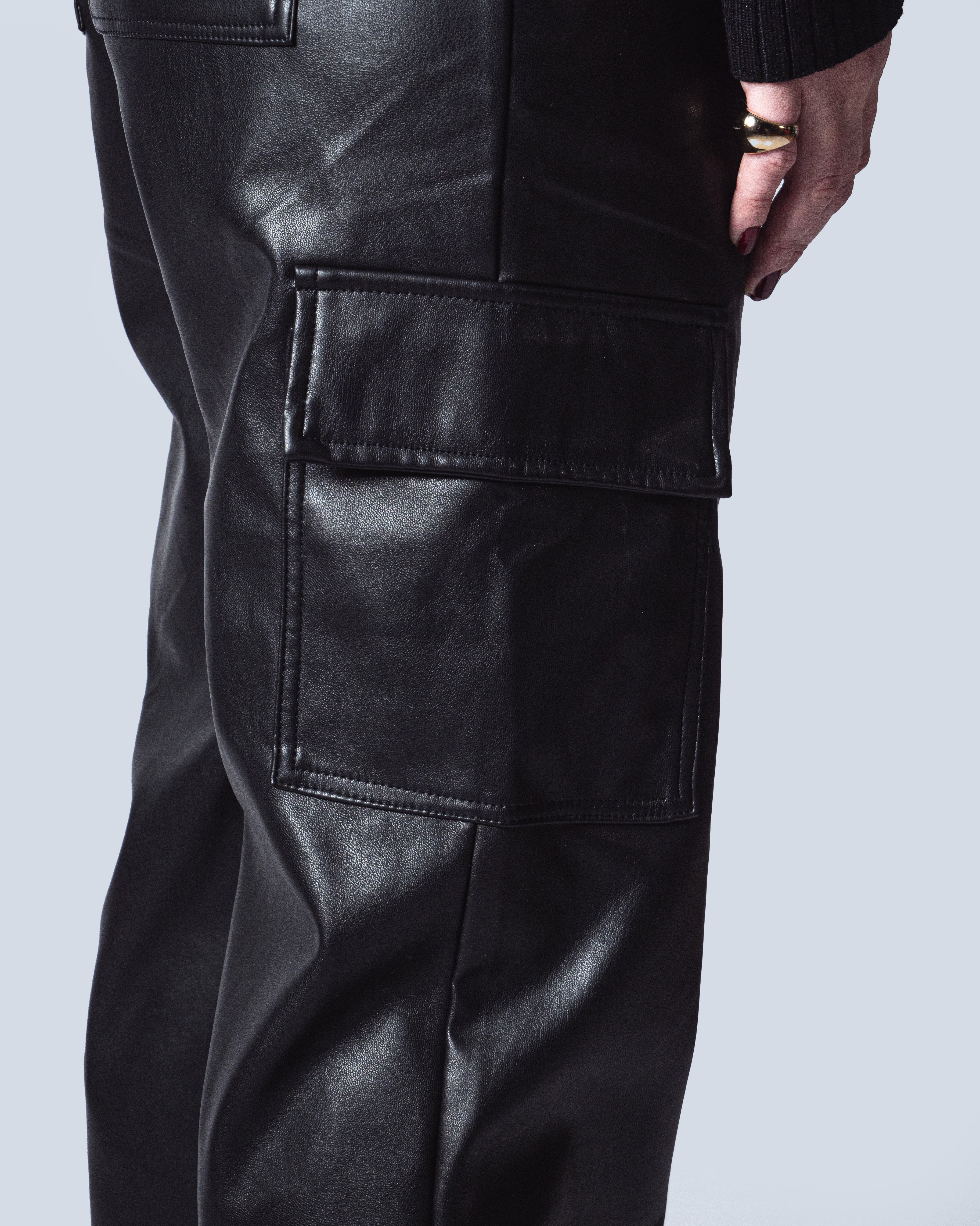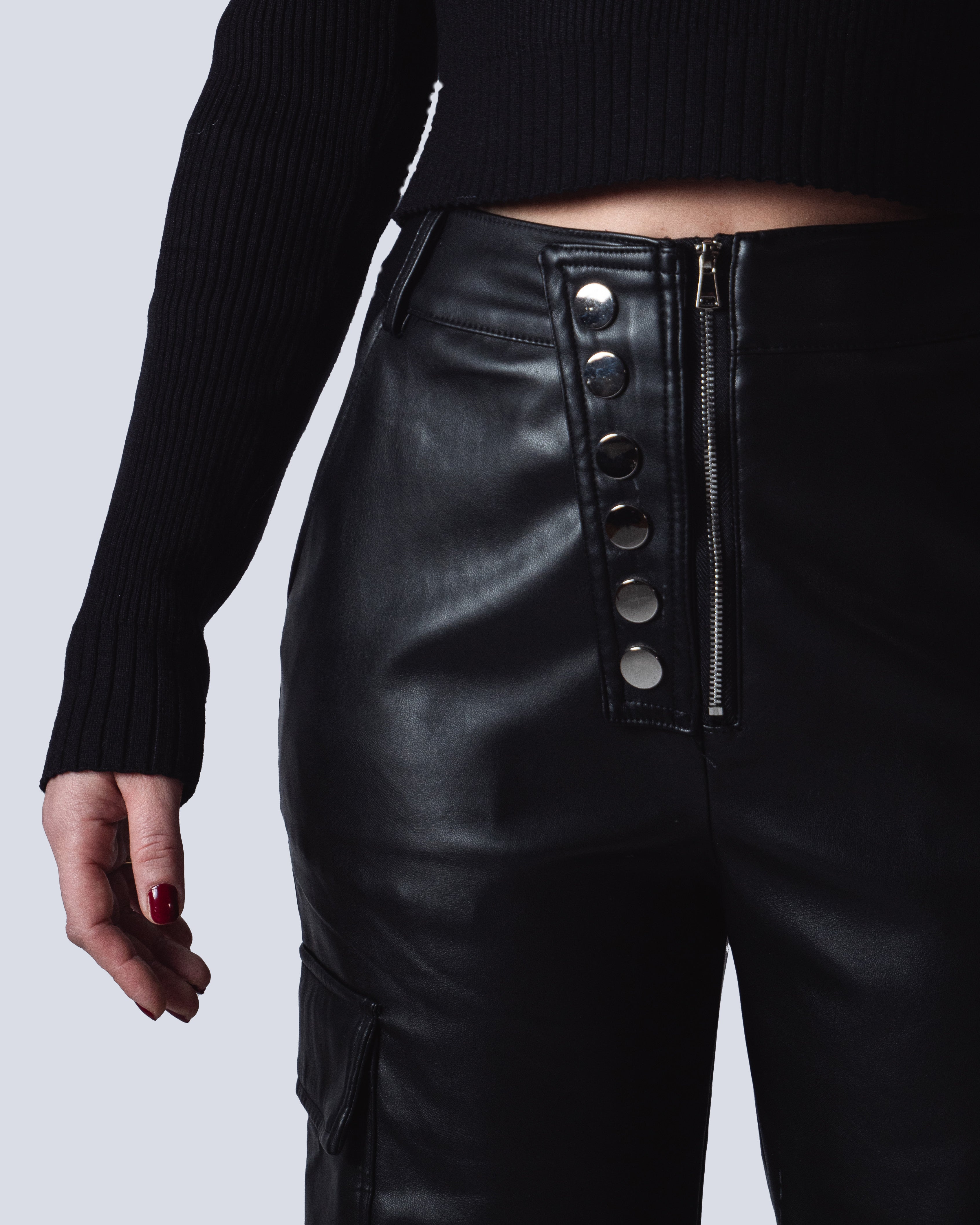 Pantalone nero cargo in simil pelle.Tasche laterali e gamba dritta.Chiusura con bottoni  metallici e cerniera.