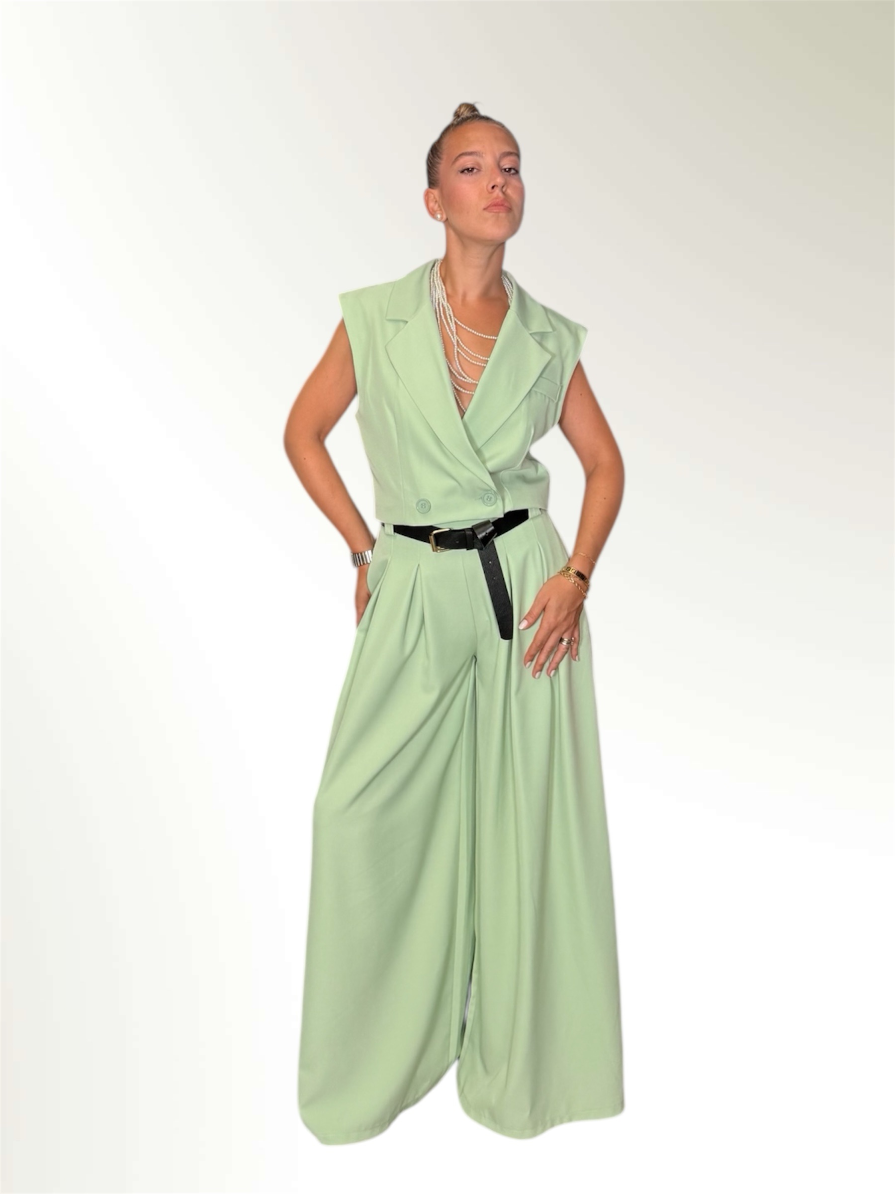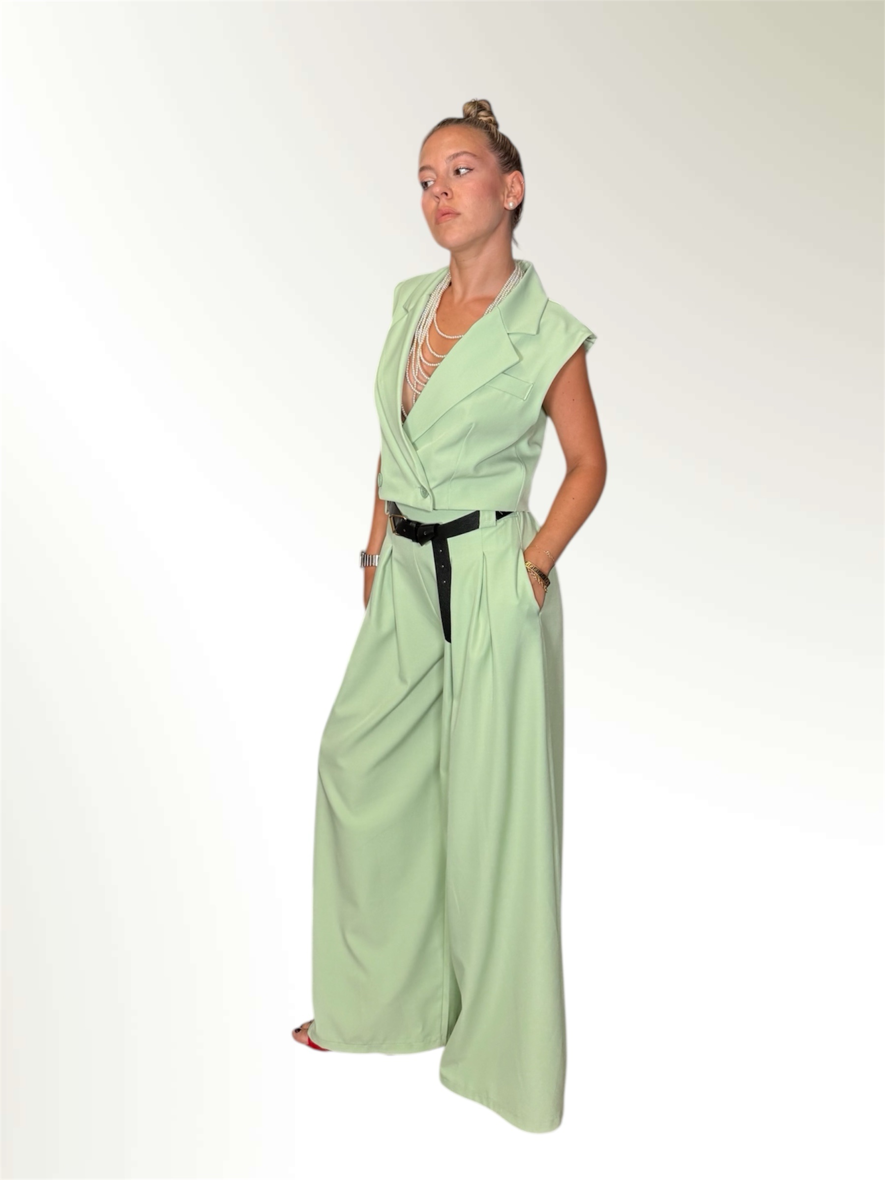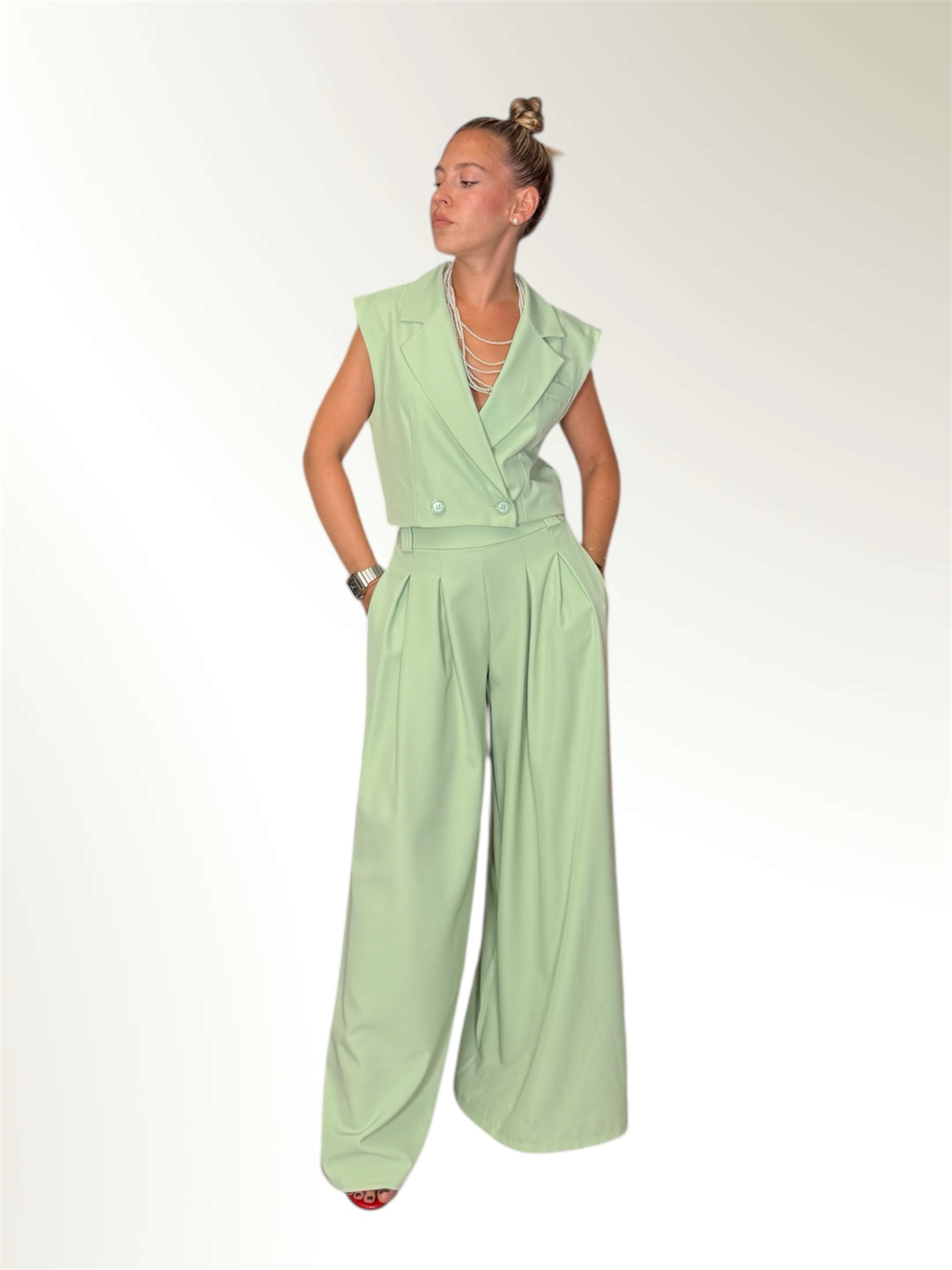 Completo composto da gilet crop e pantalone ampio entrambi taglia unica.Il pantalone ha l elastico in vita e le pences.