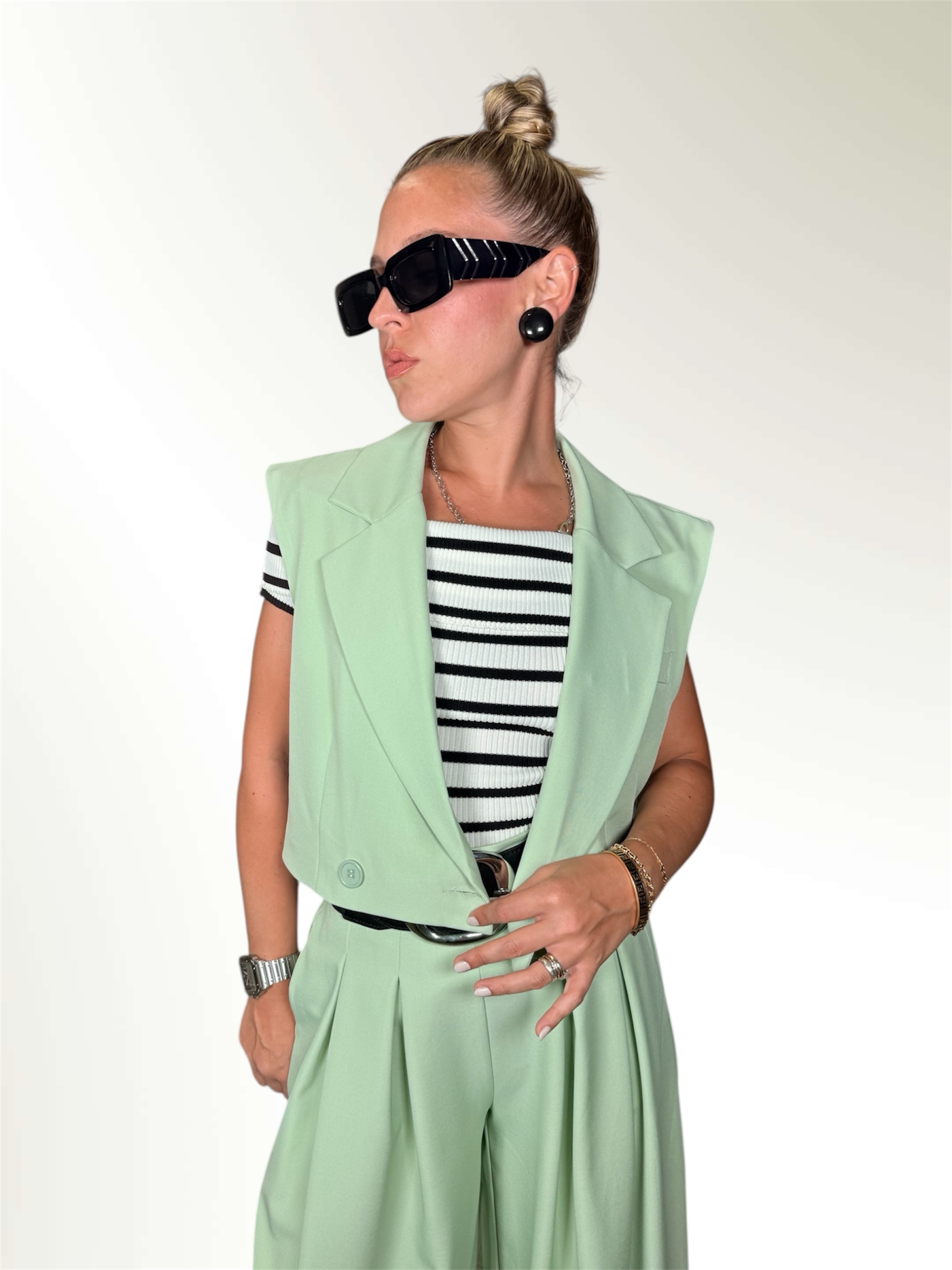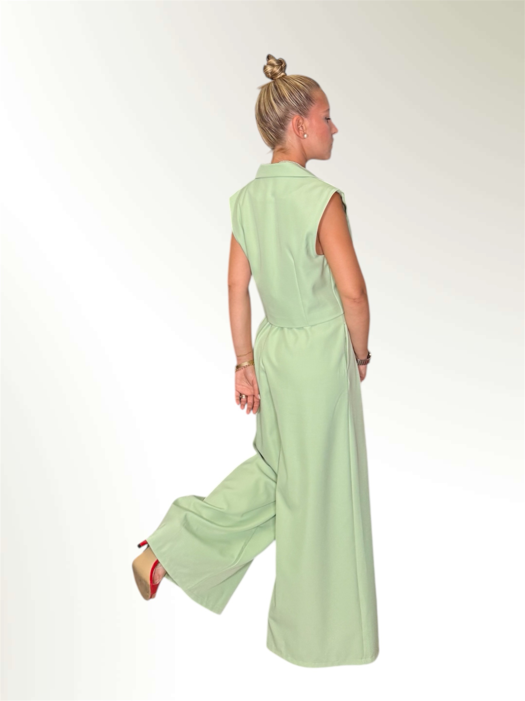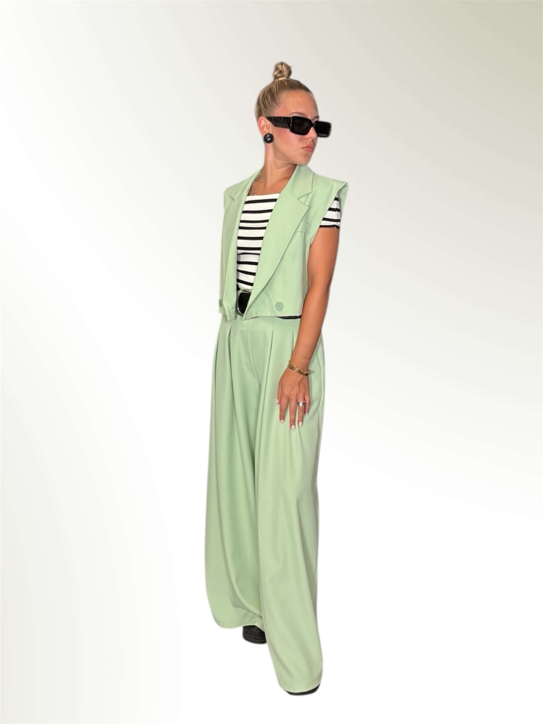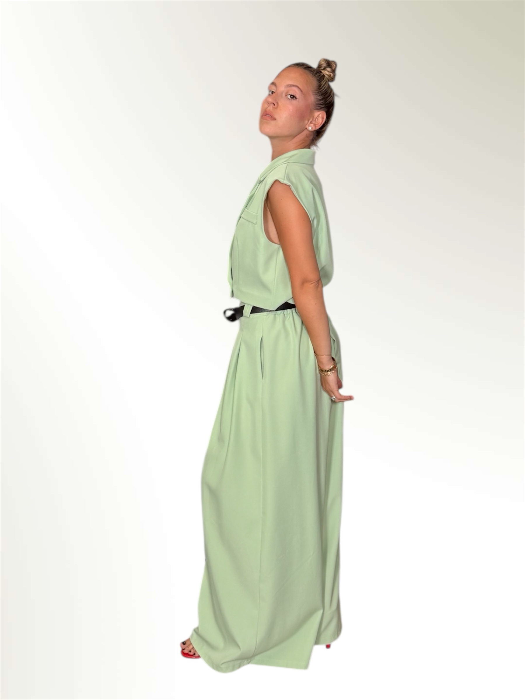 Completo composto da gilet crop e pantalone ampio entrambi taglia unica.Il pantalone ha l elastico in vita e le pences.