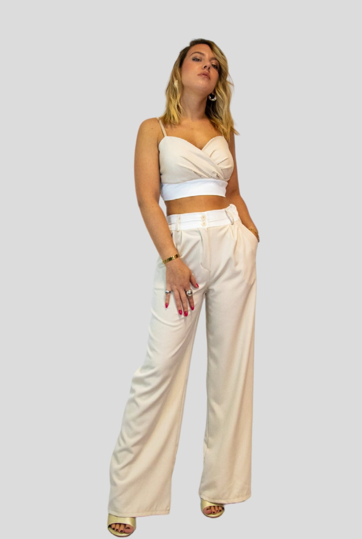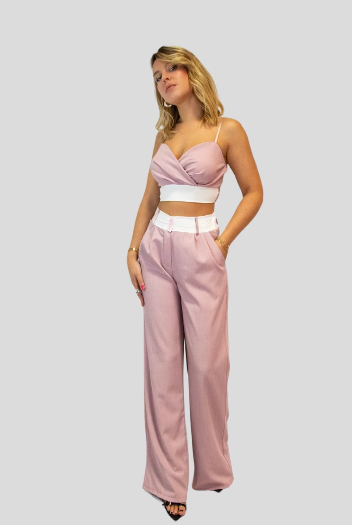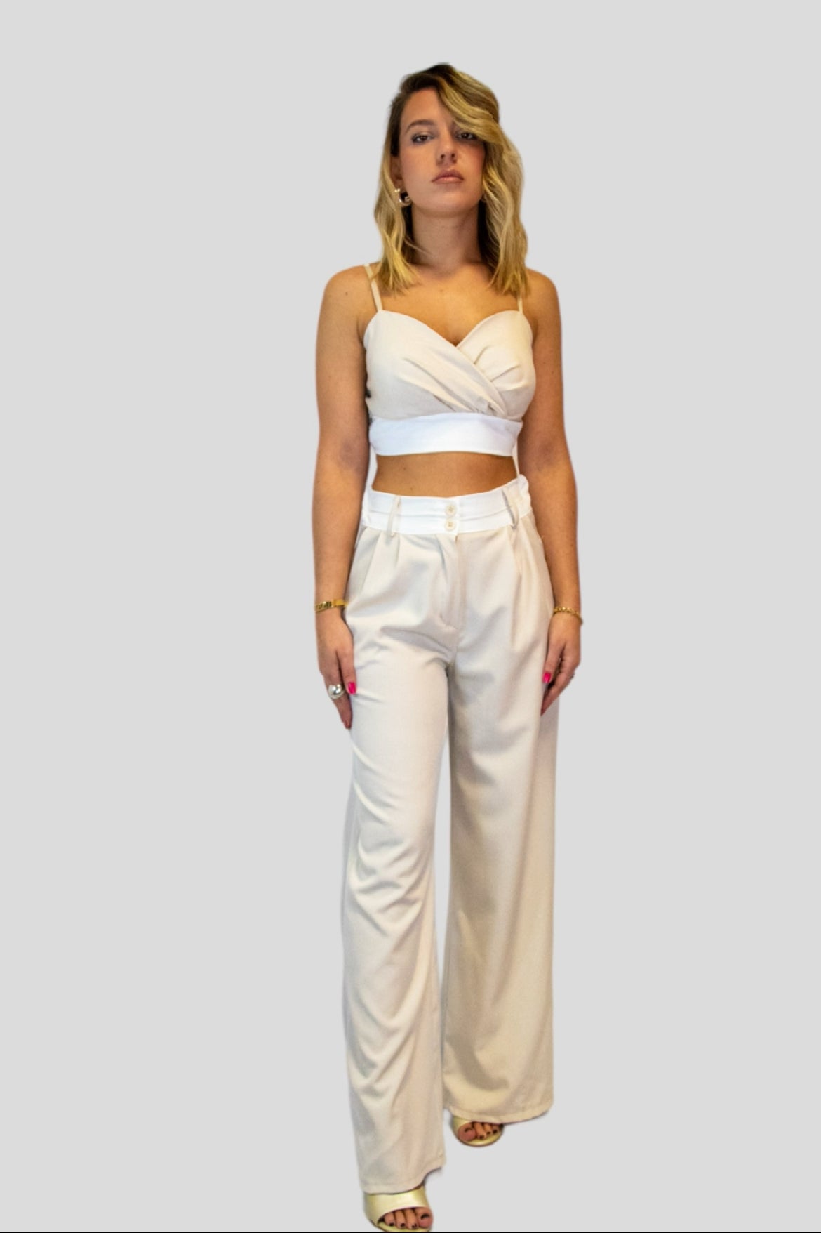 Coordinato composto da Pantaloni palazzo vita alta bicolore abbinati al suo top  con spalline regolabili.Il coordinato è versatile per diverse occasioni tra cui cerimonie,ufficio,aperitivi cene basta semplicemente giocare su scarpe e accessori.