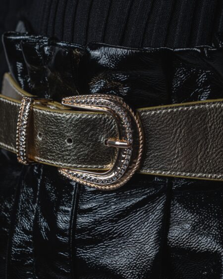 Cintura larga 4 cm e realizzata in pelle sintetica. Dettaglio: fibbia metallica con brillantini incastonati e retro elasticizzato. Veste dalla Xs alla L. Taglia unica