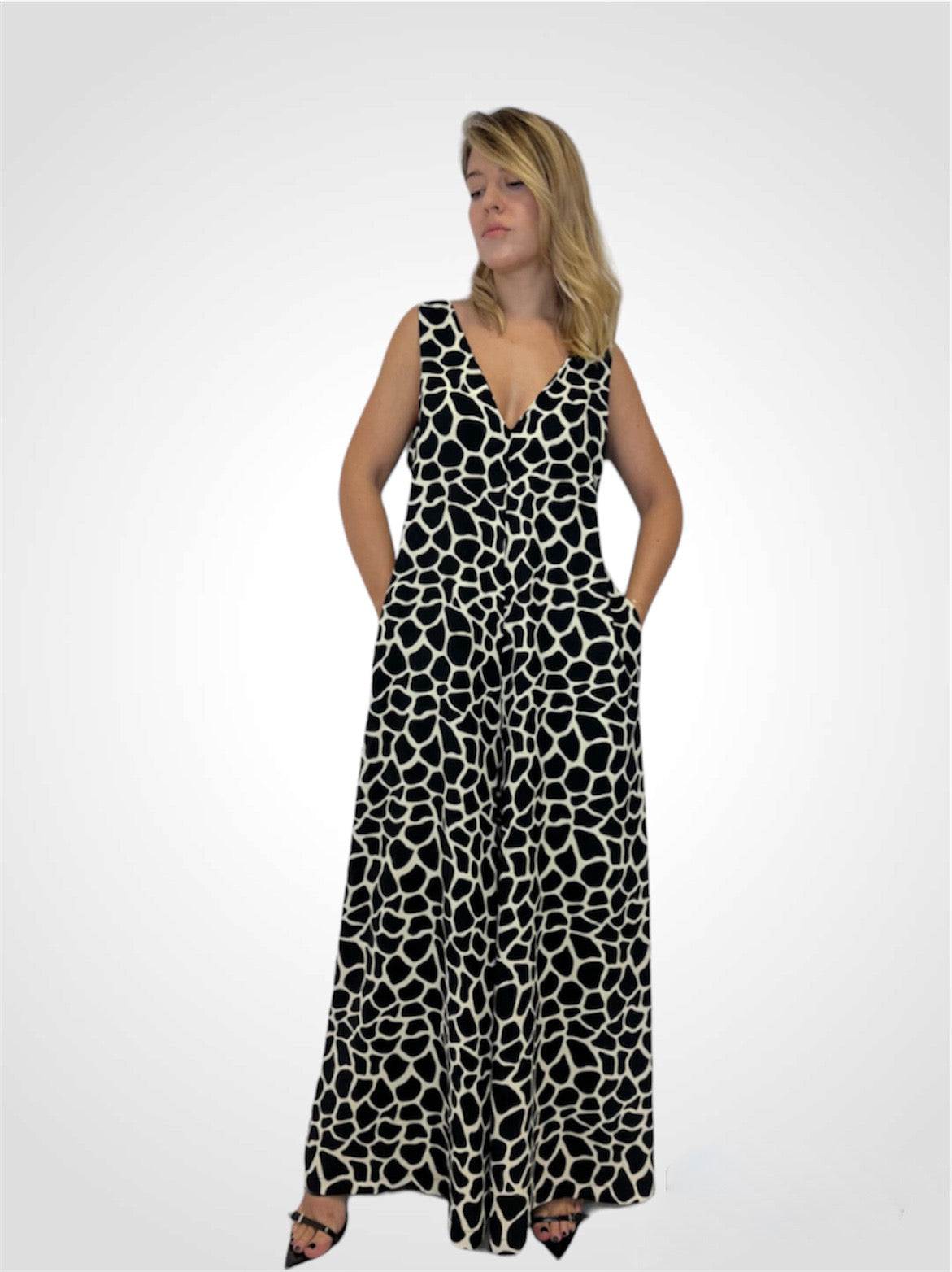 Tuta Jumpsuit stampa giraffa con tasche,vestibilitá ampia,fresca e versatile.
