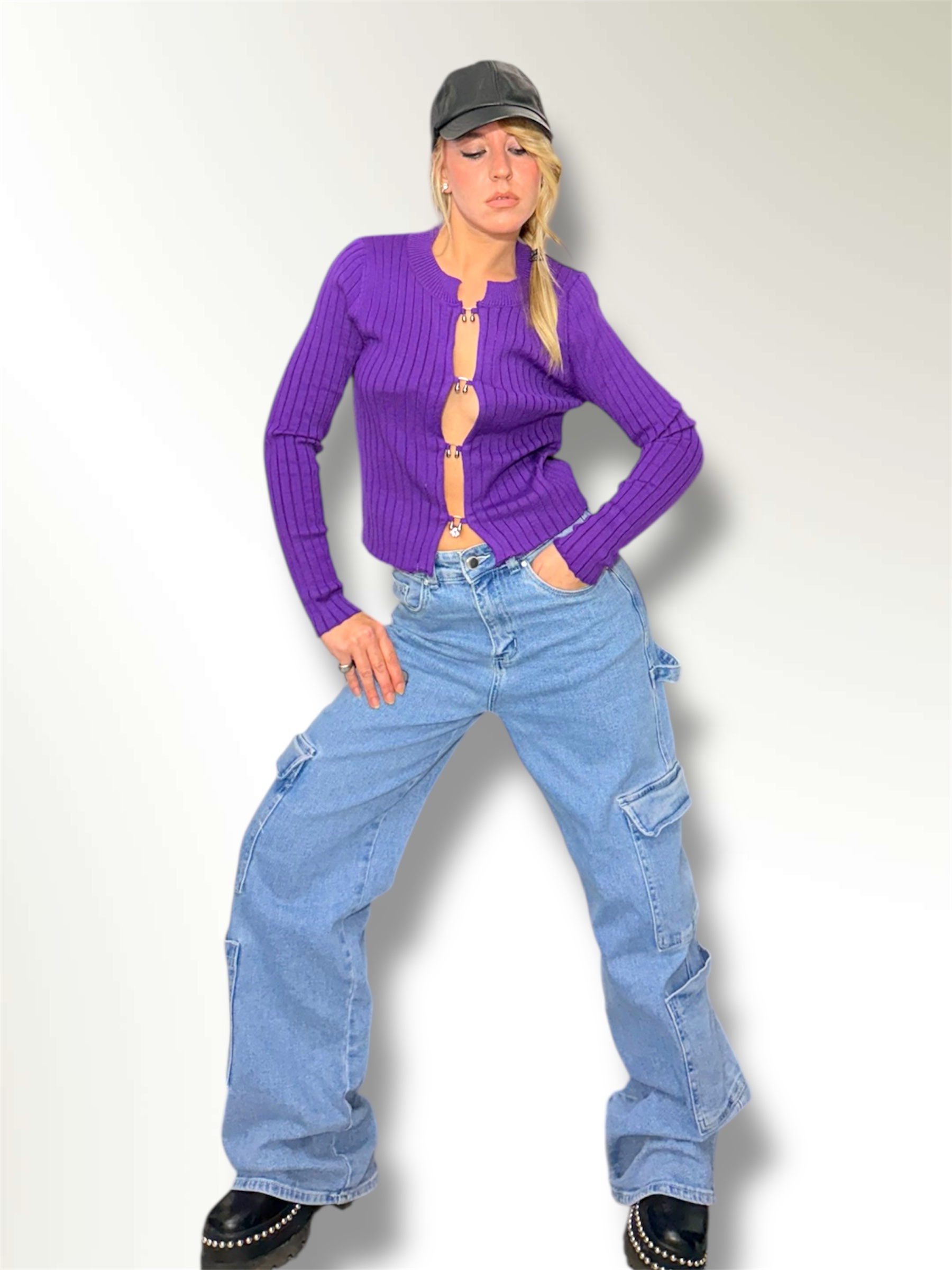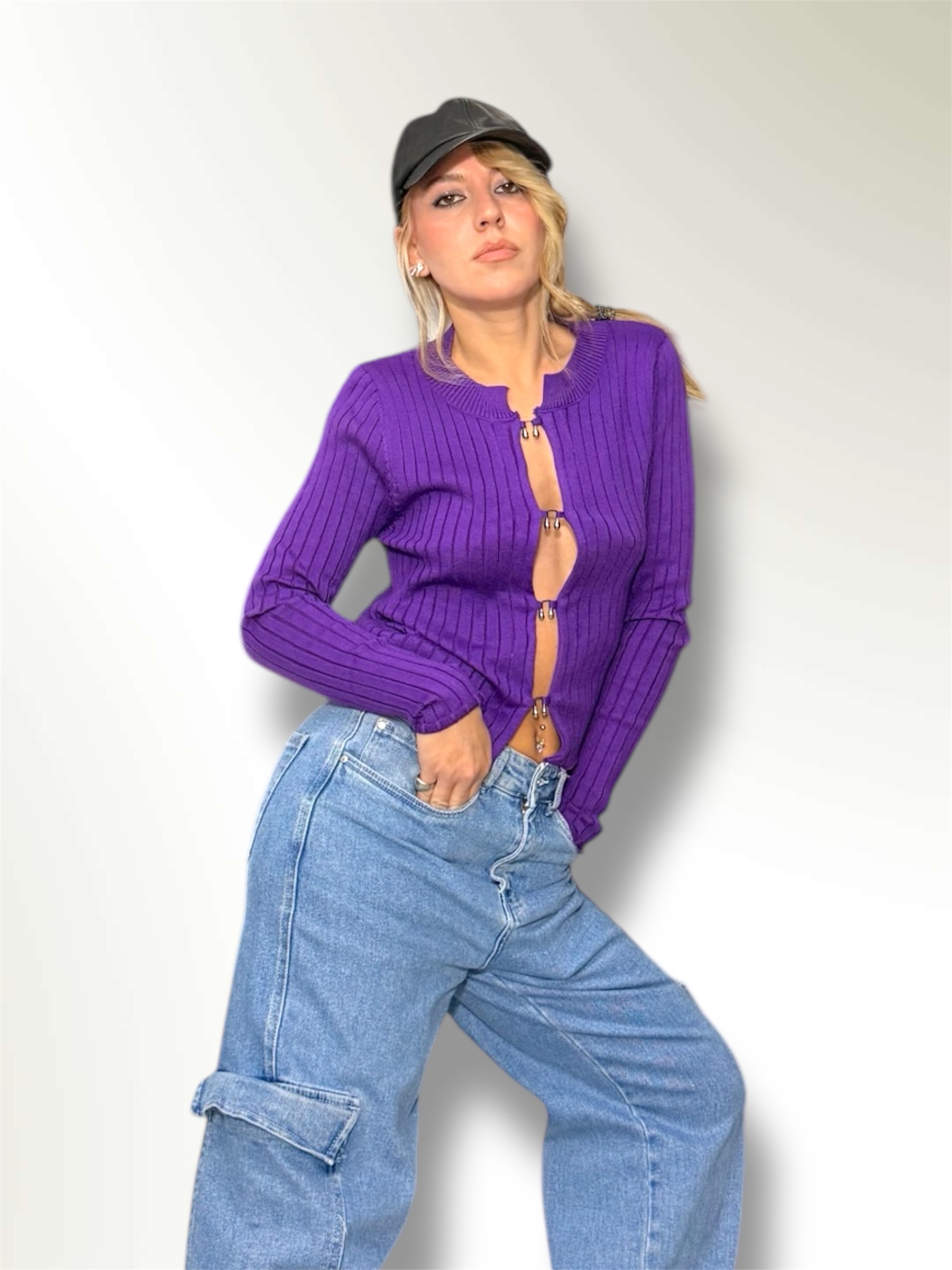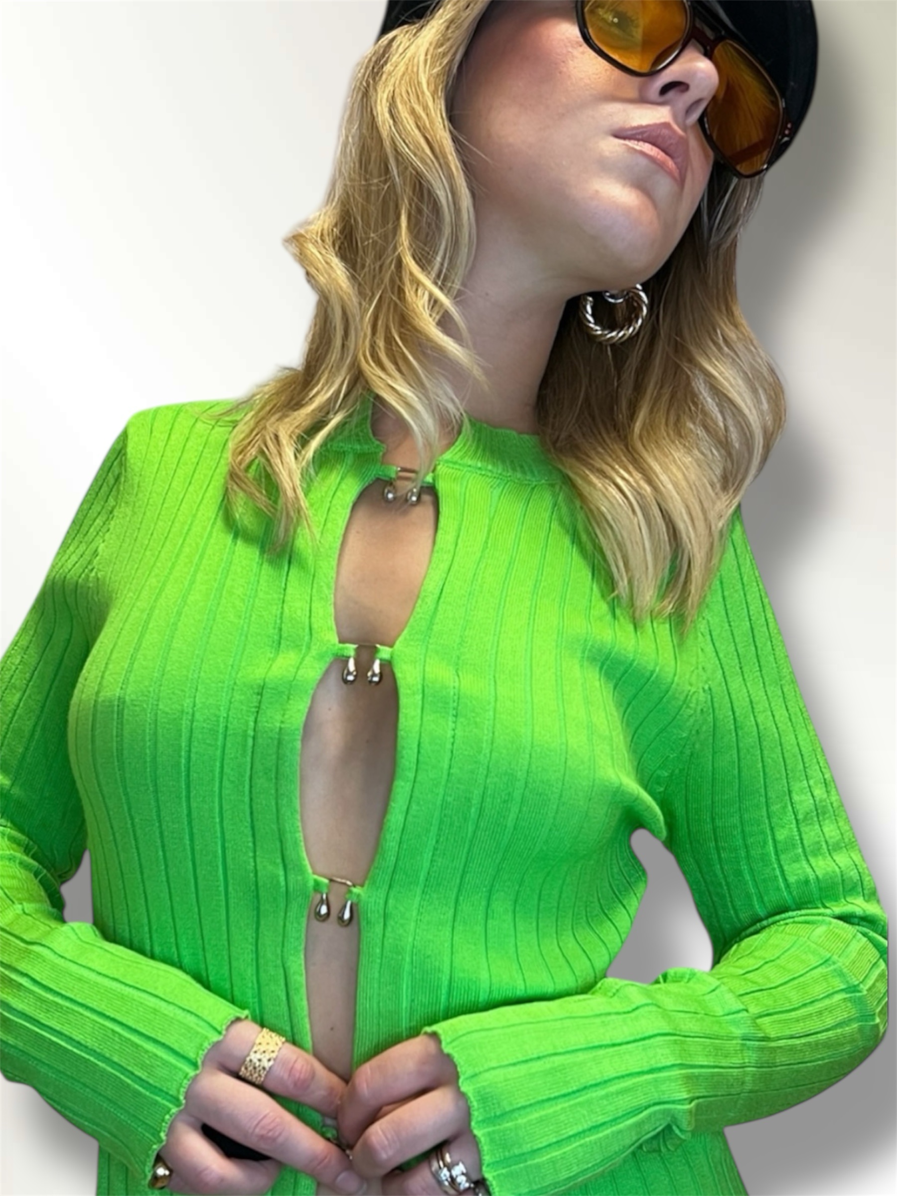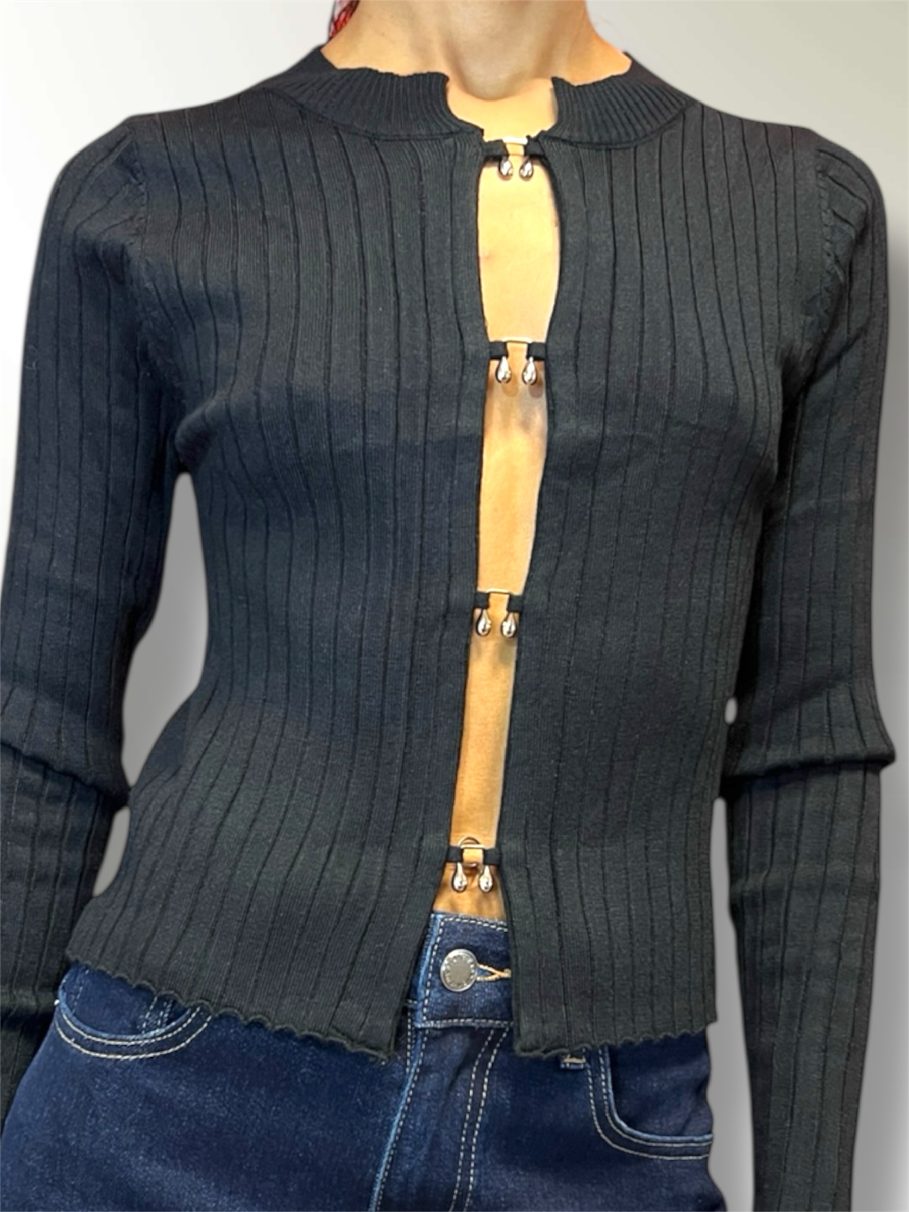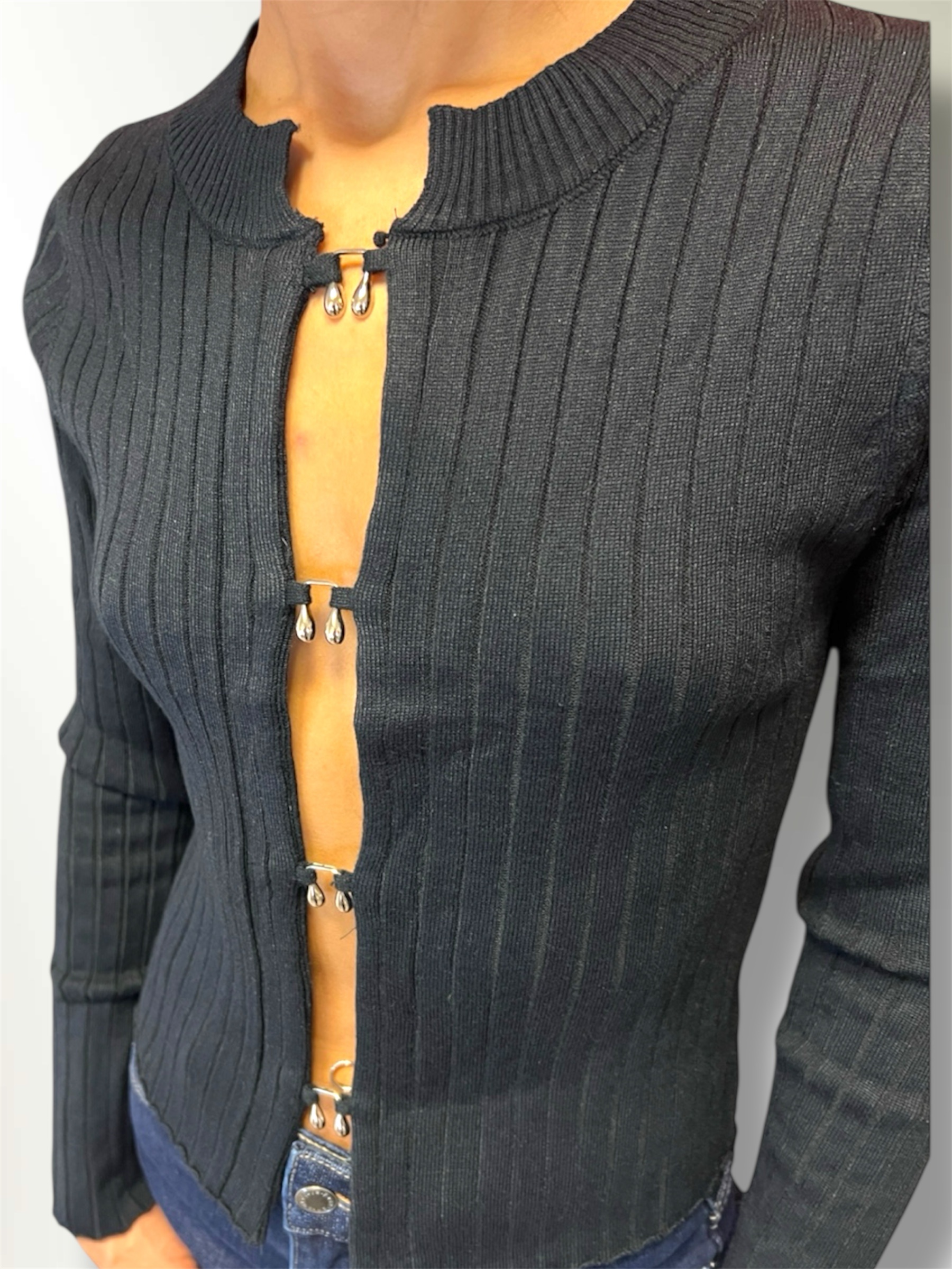 Maglia misto lana a costine con scollo a V.Regular fit. Veste dalla Xs alla L. Taglia unica. COMPOSIZIONE: 70% poliestere 21% poliamidico 8% lana 1% elastan