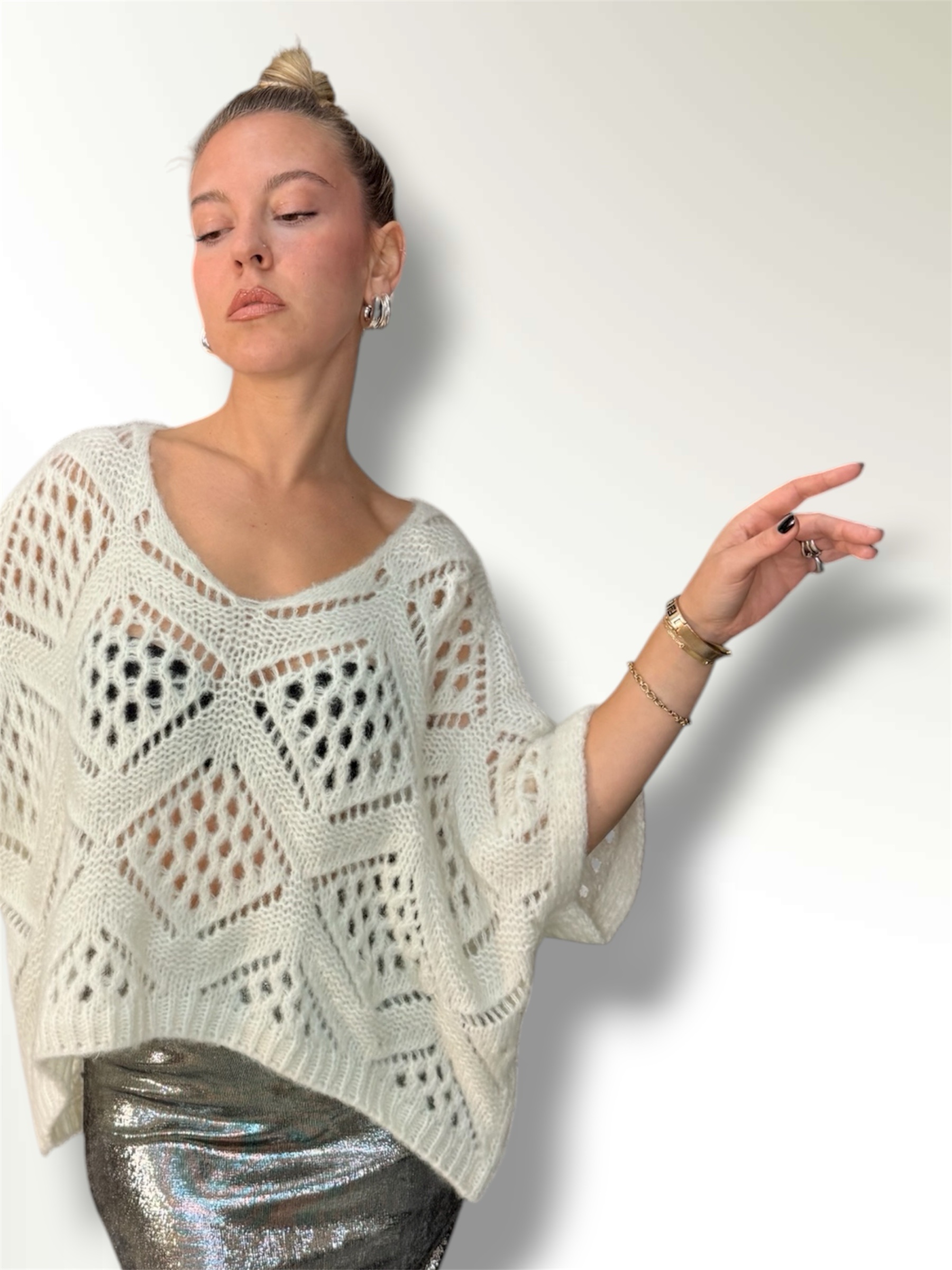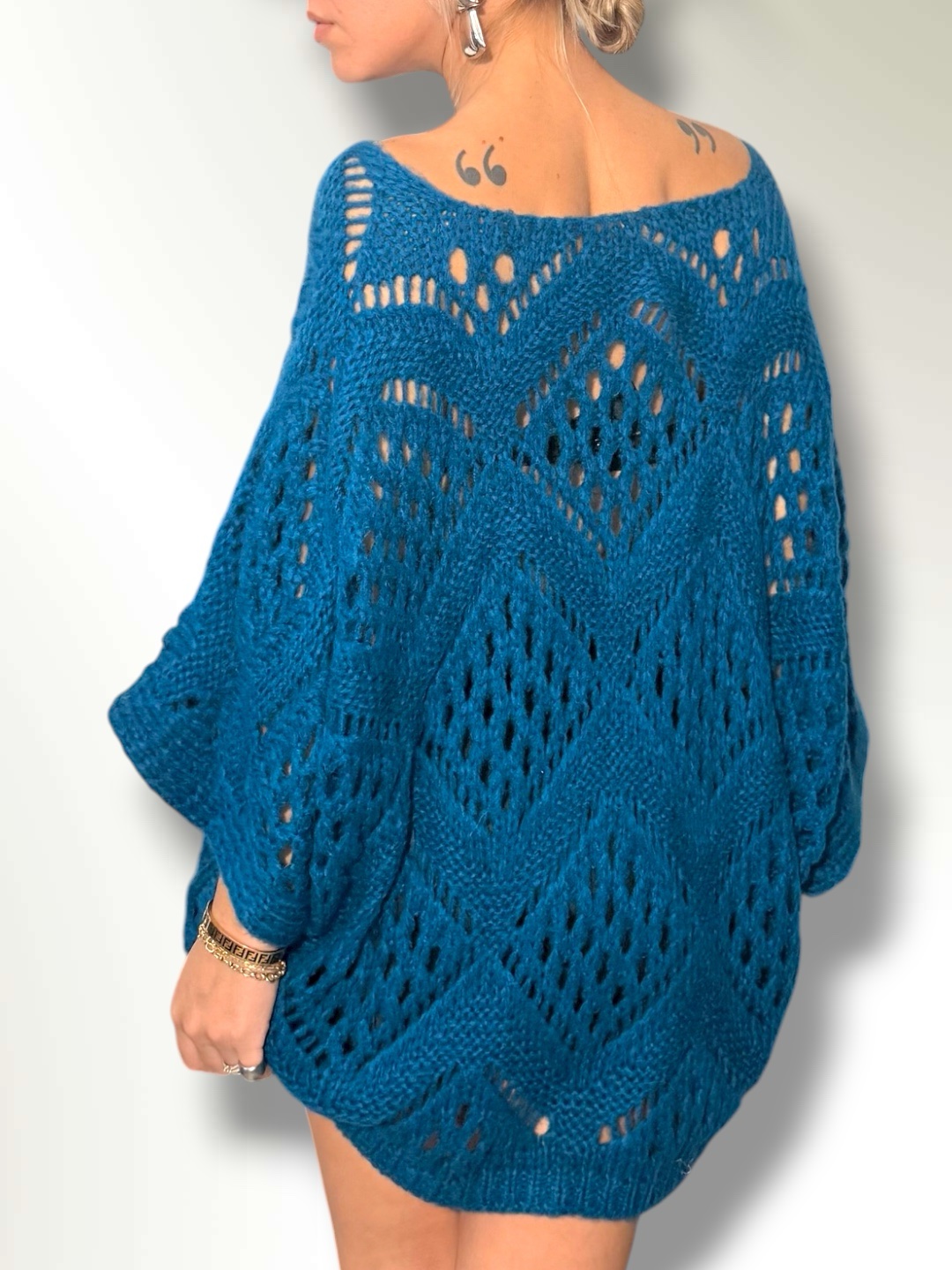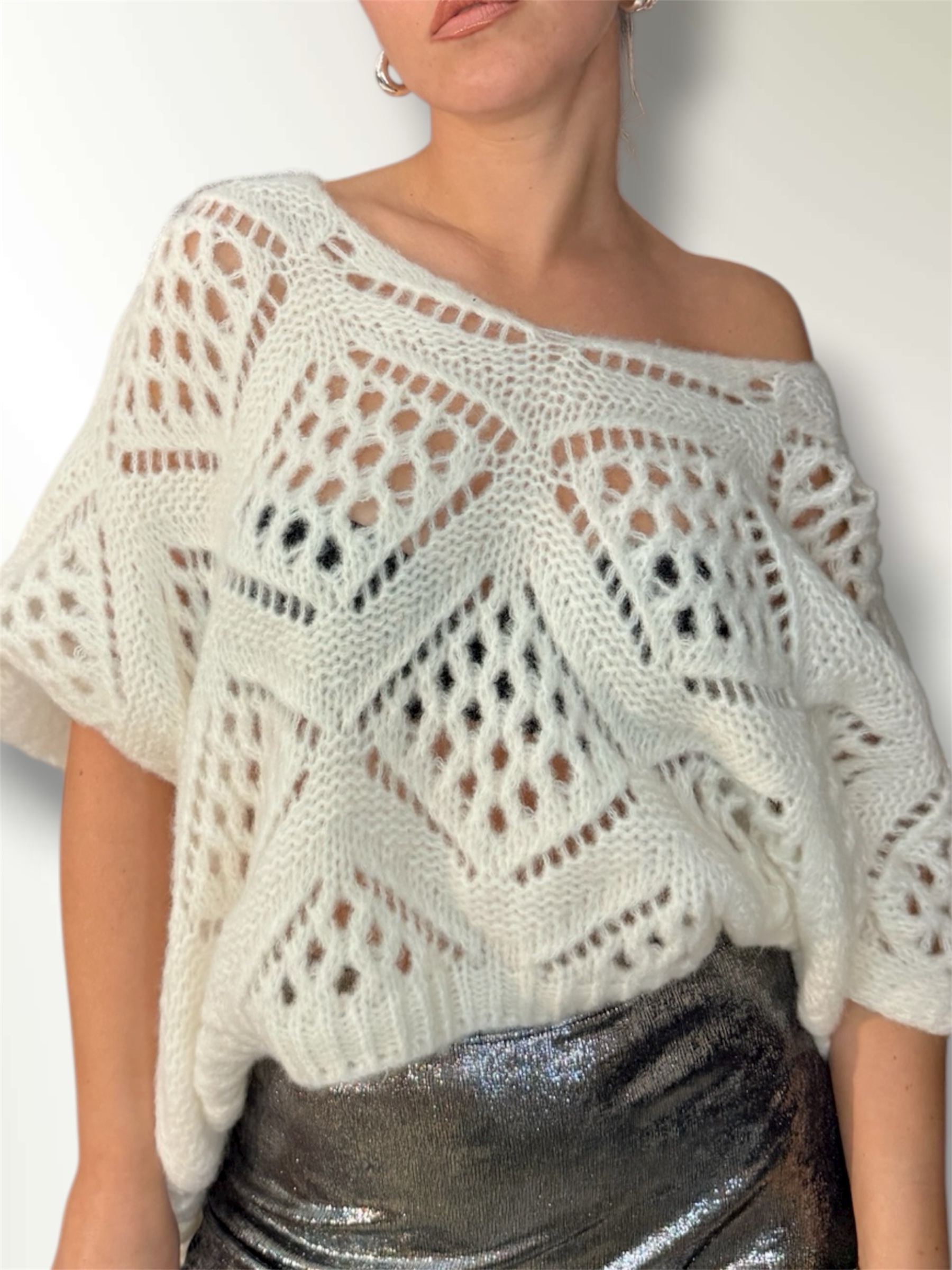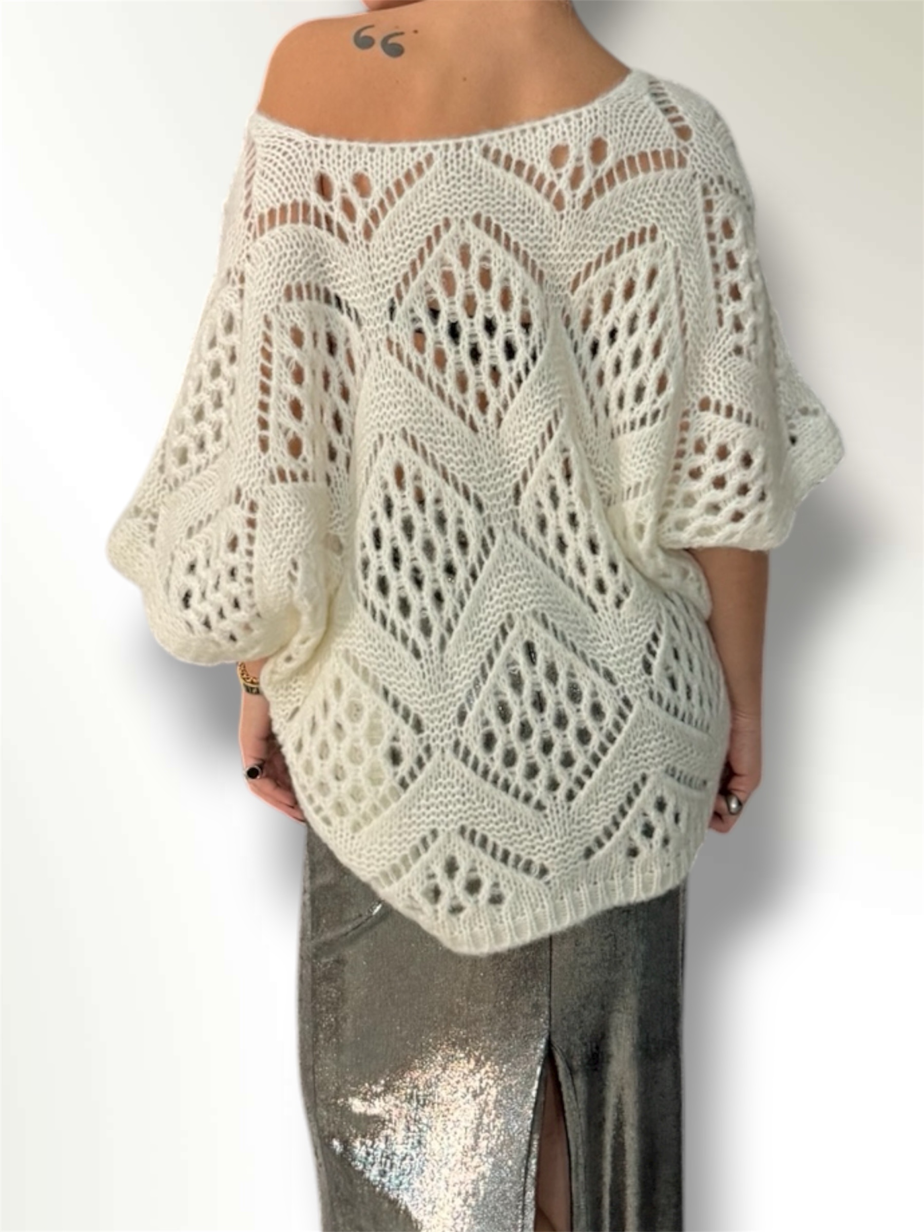 Maglia traforata in misto lana taglio over con maniche a pipistrello.