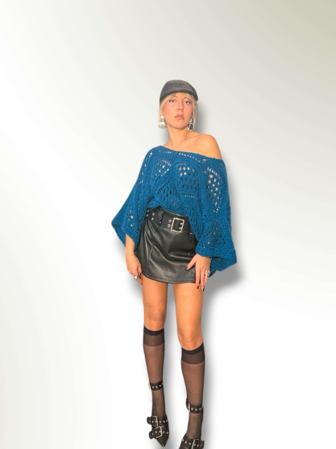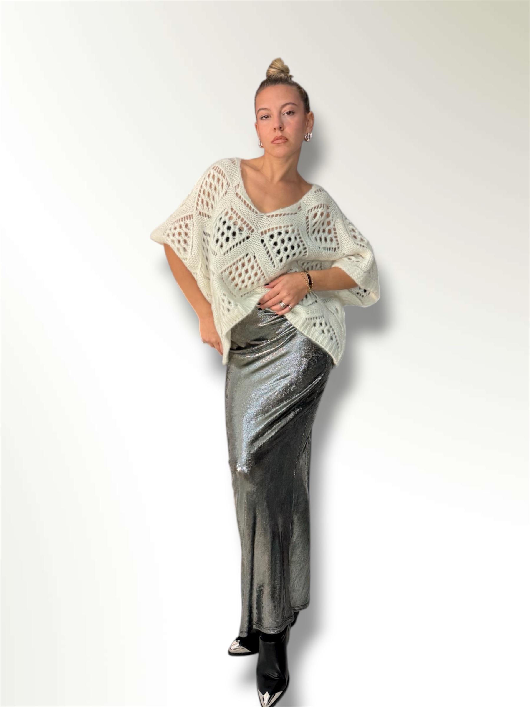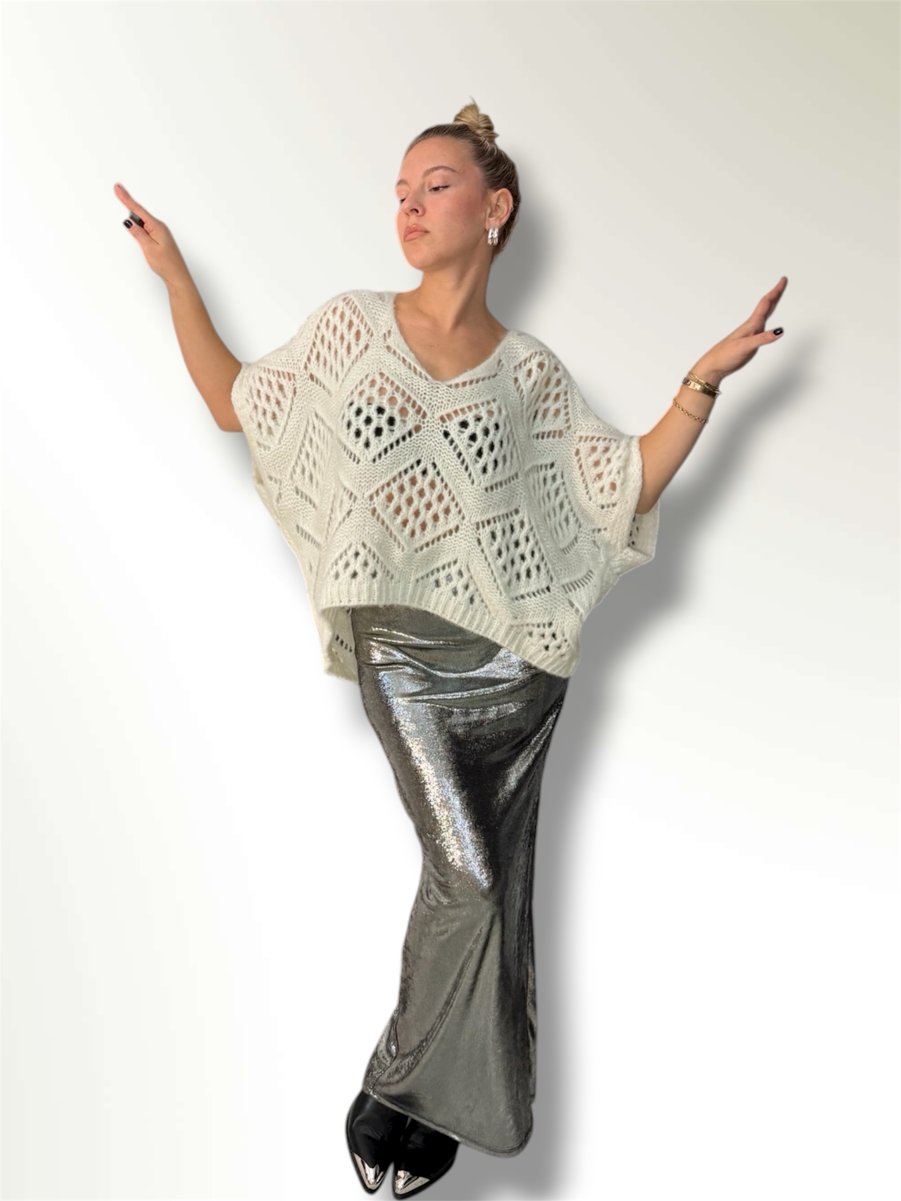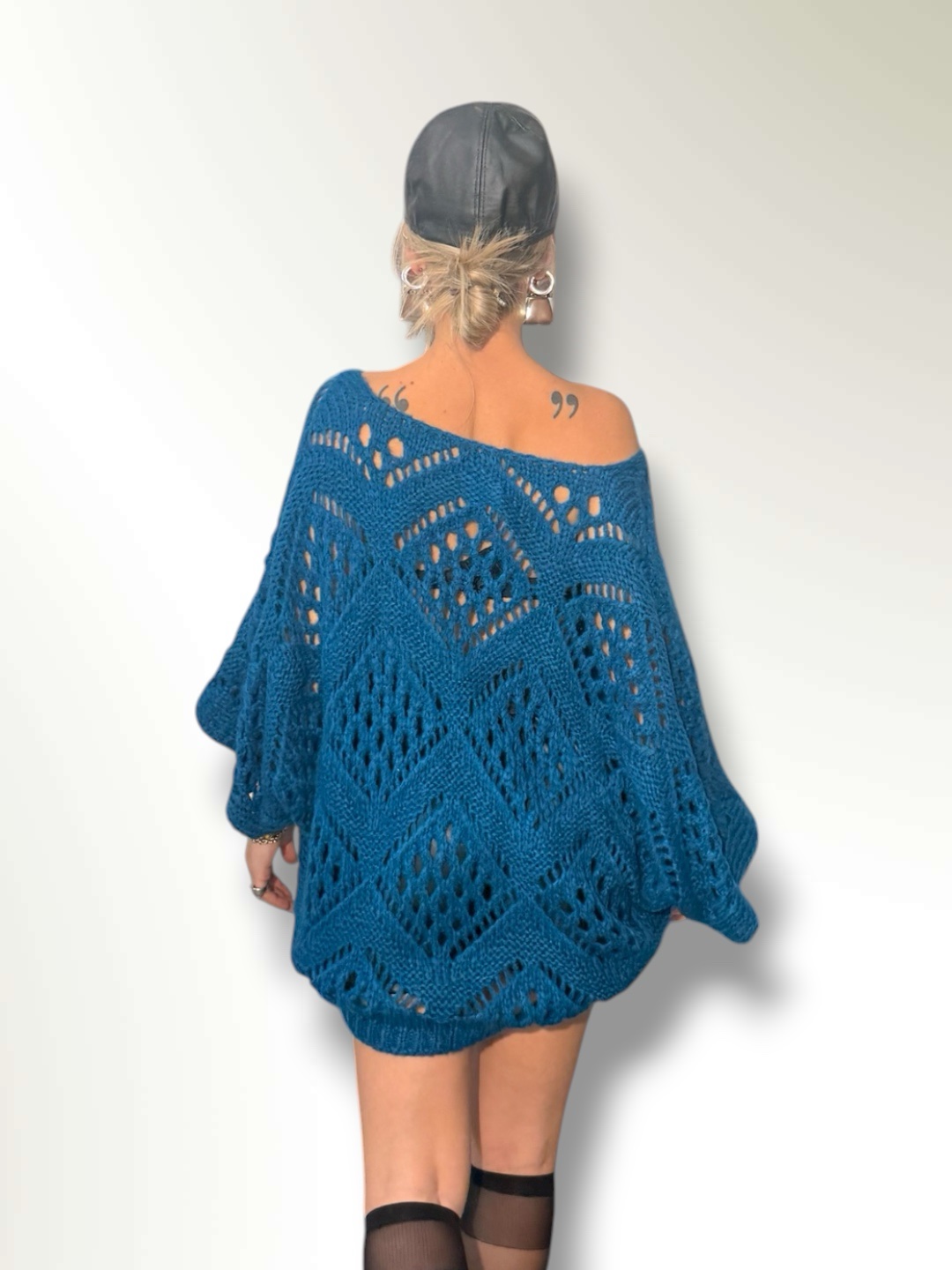Maglia traforata in misto lana taglio over con maniche a pipistrello.