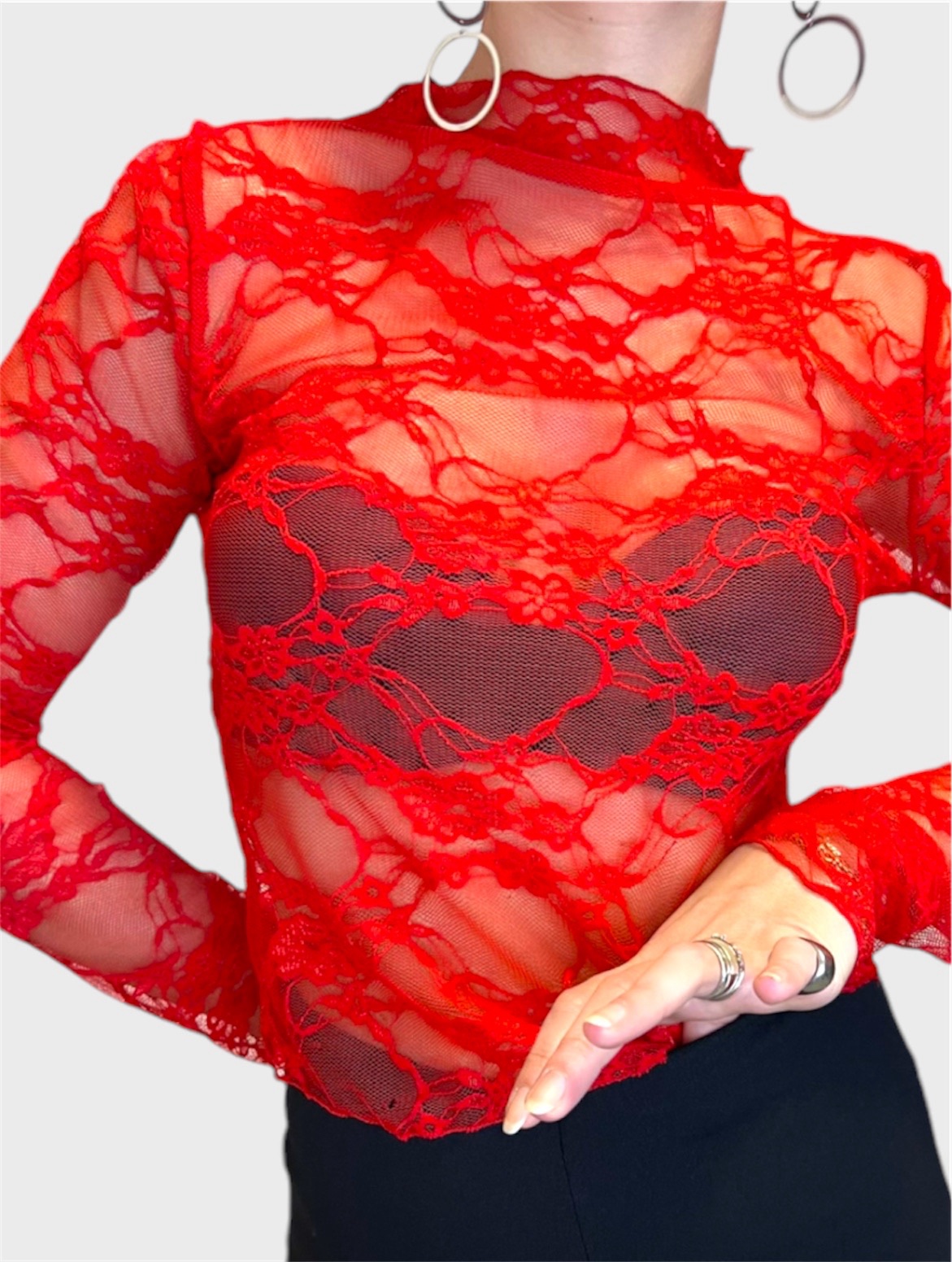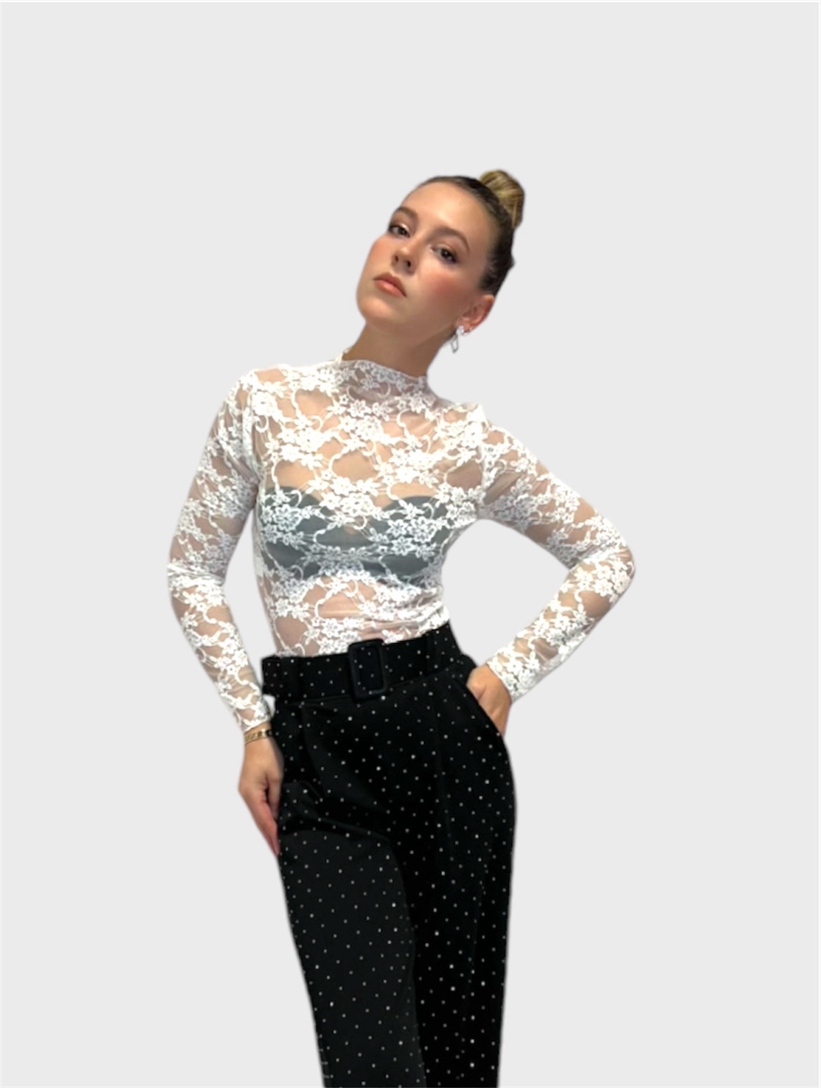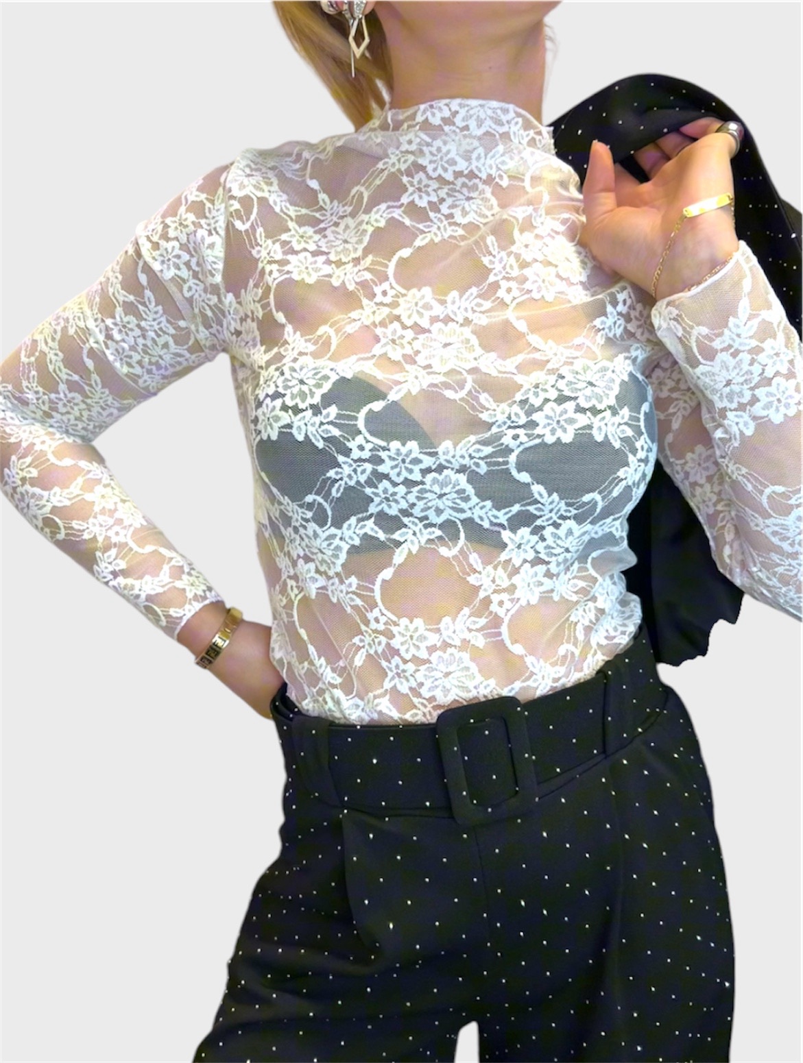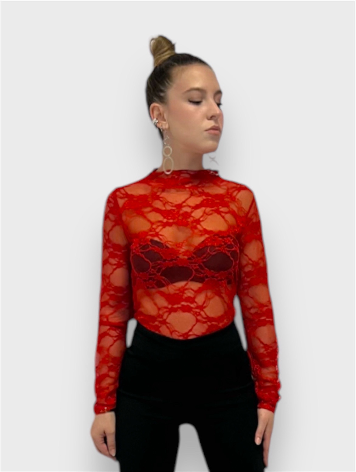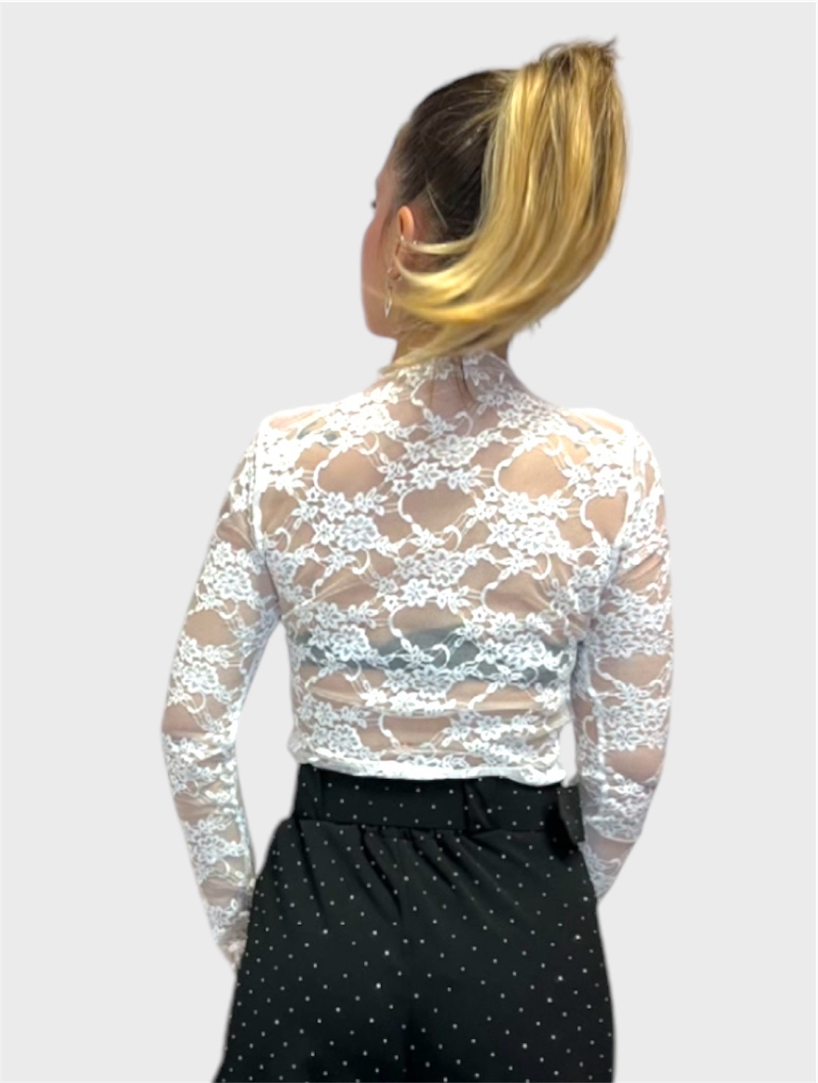 Maglia maniche lunghe aderente con lupetto in pizzo,corta ed elasticizzata.Disponibile in più colori.