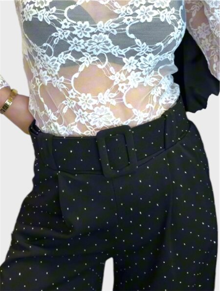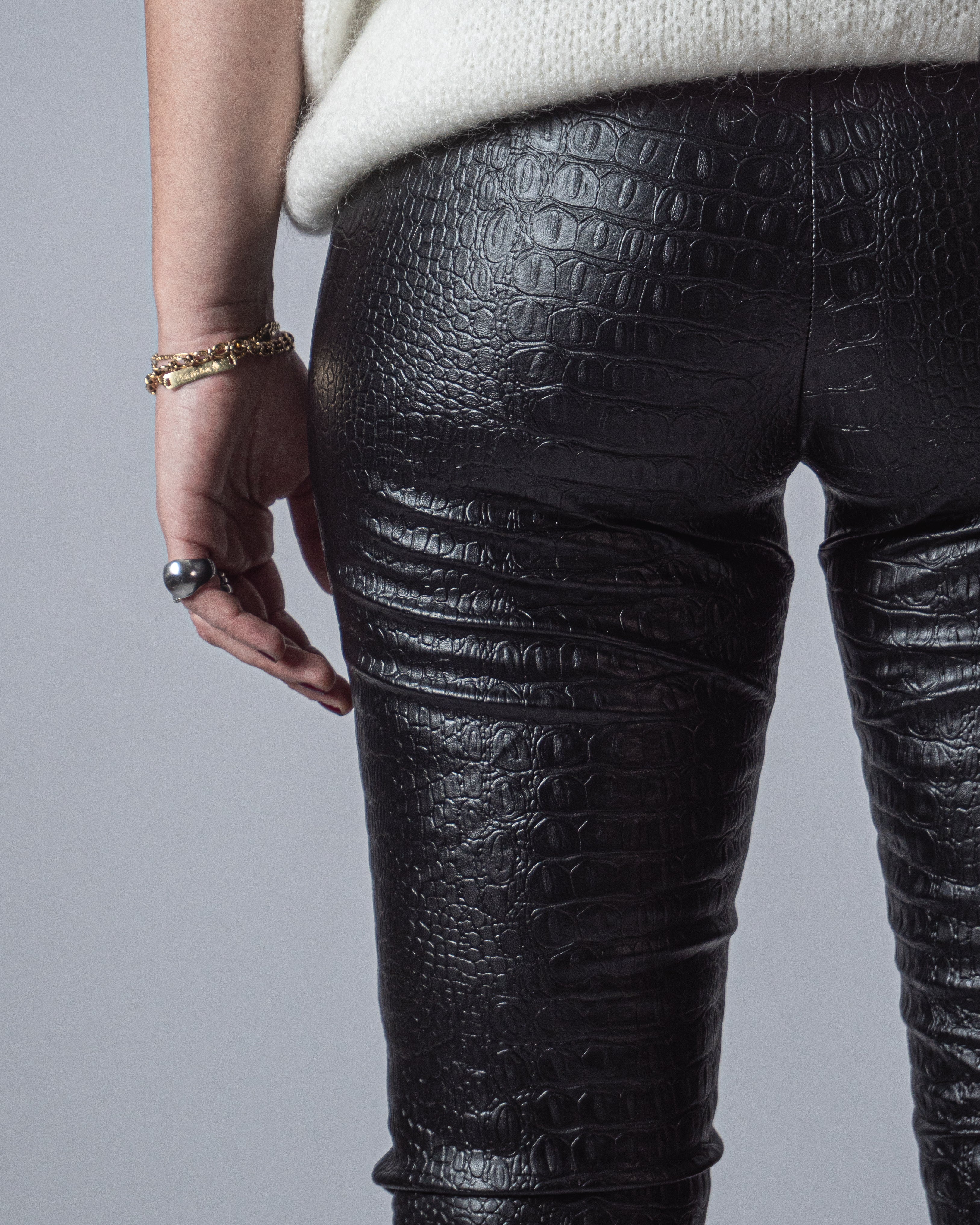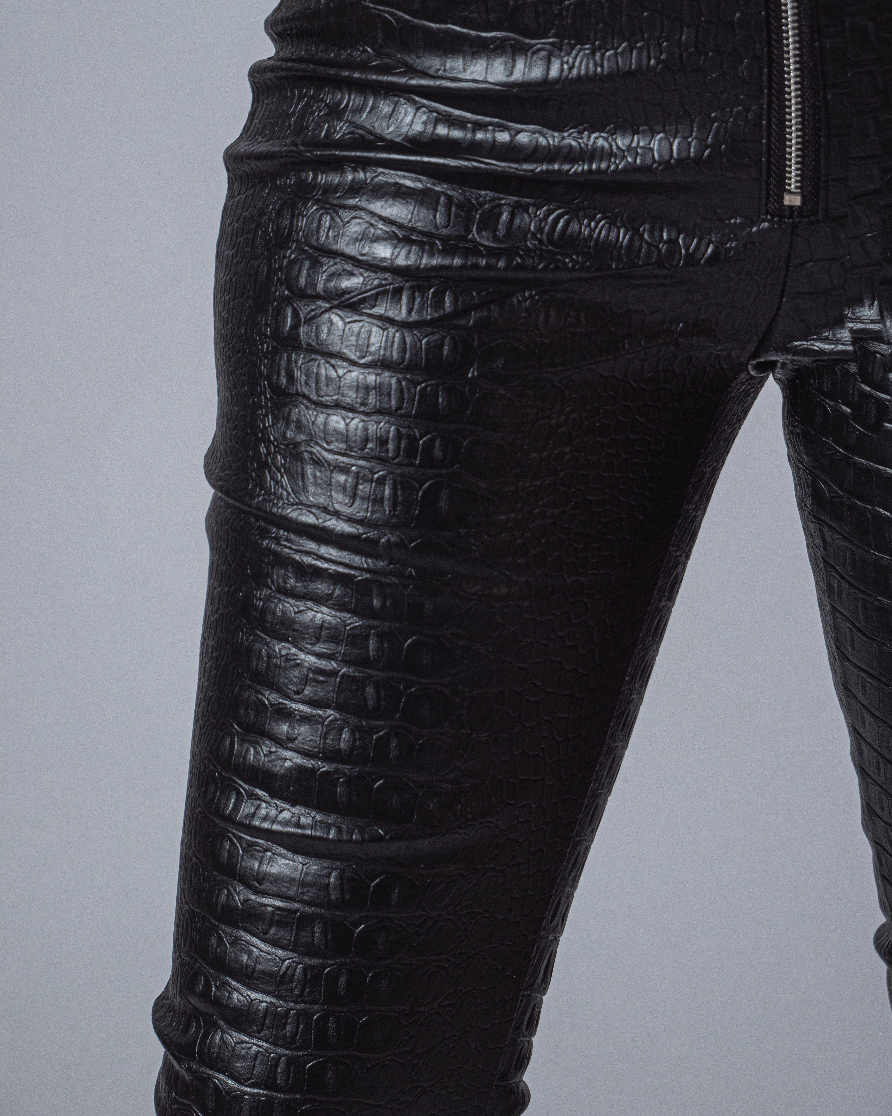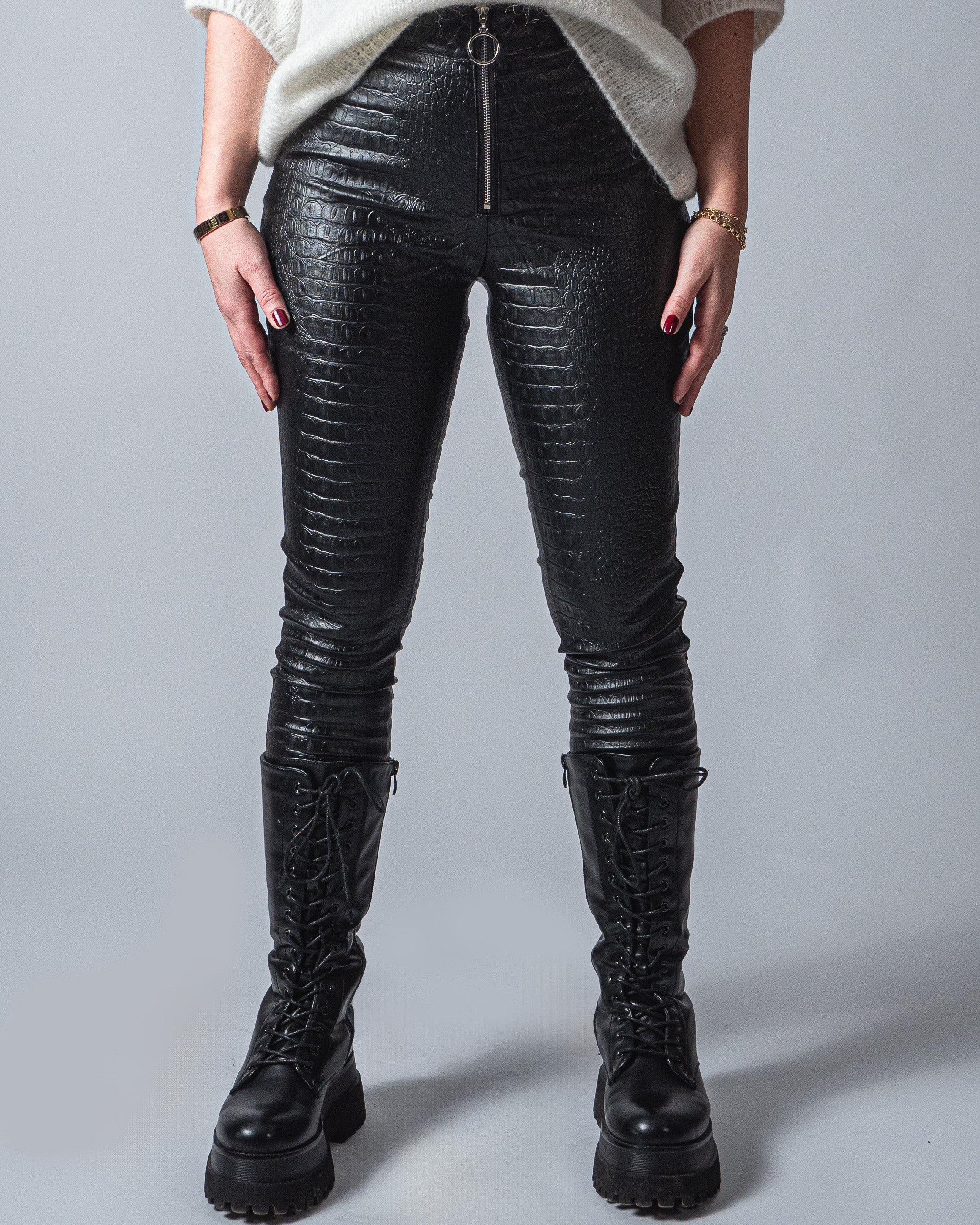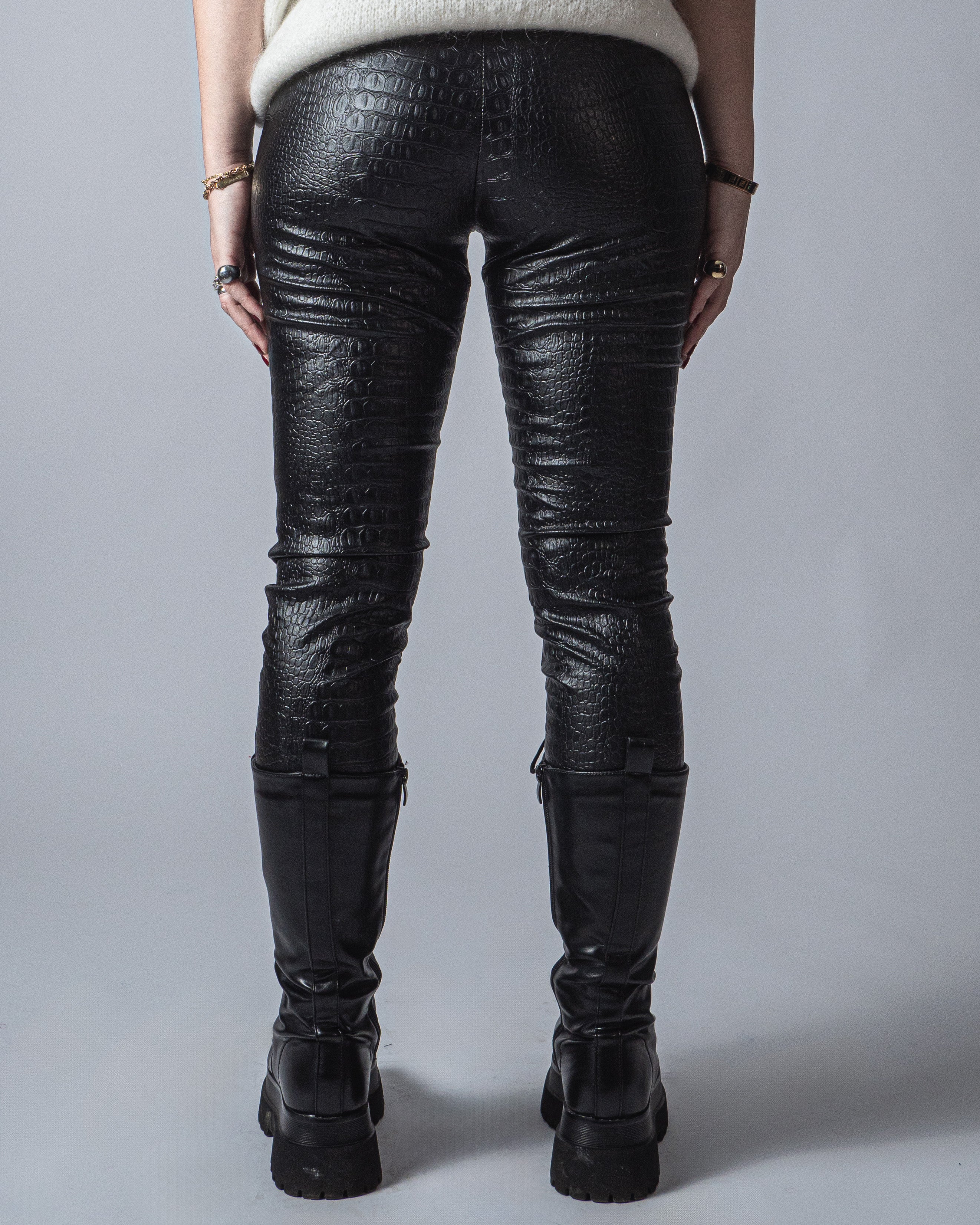 Pantalone nero in pelle sintetica stampa cocco.Pantalone skinny e chiusura frontale con zip .