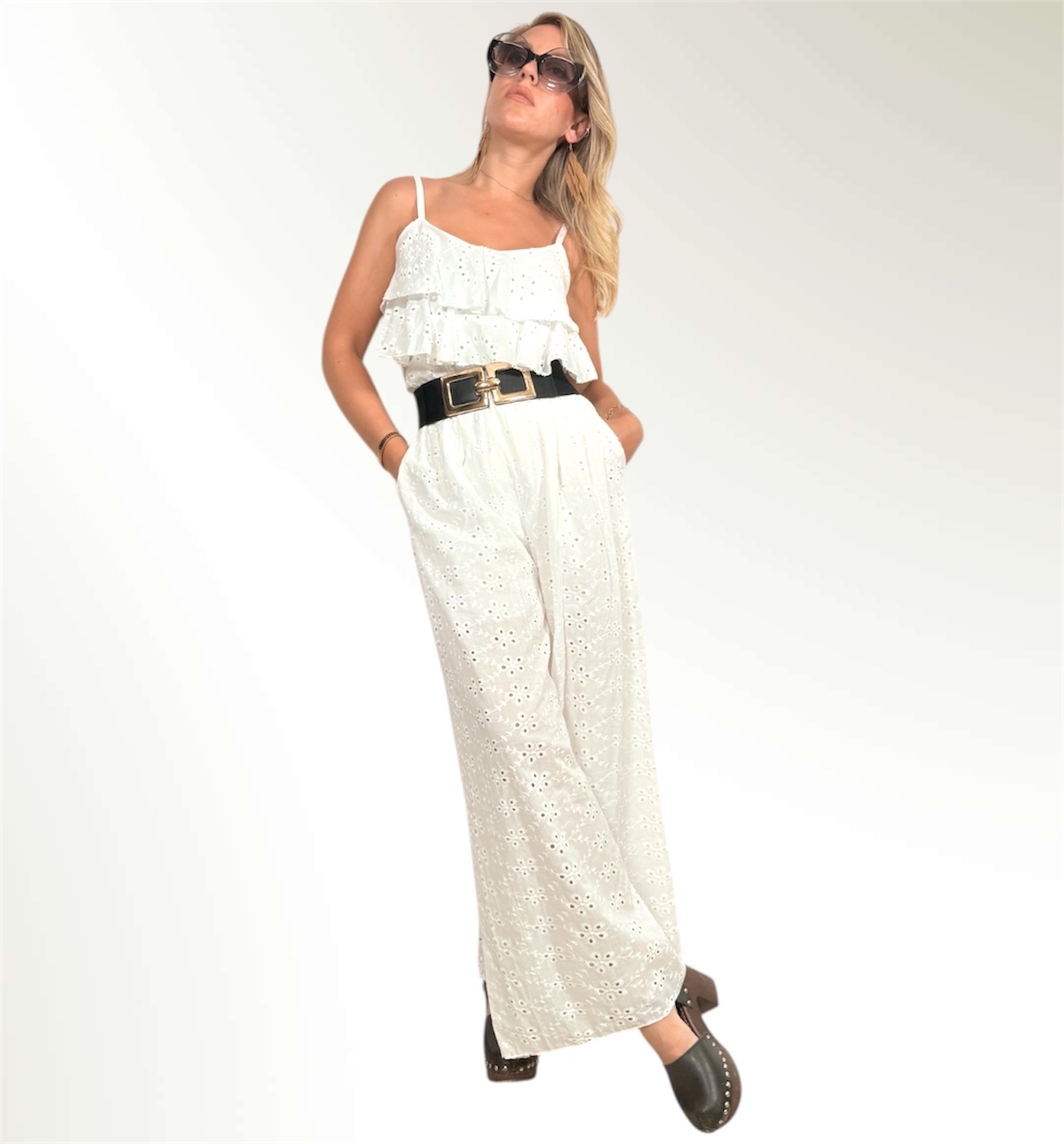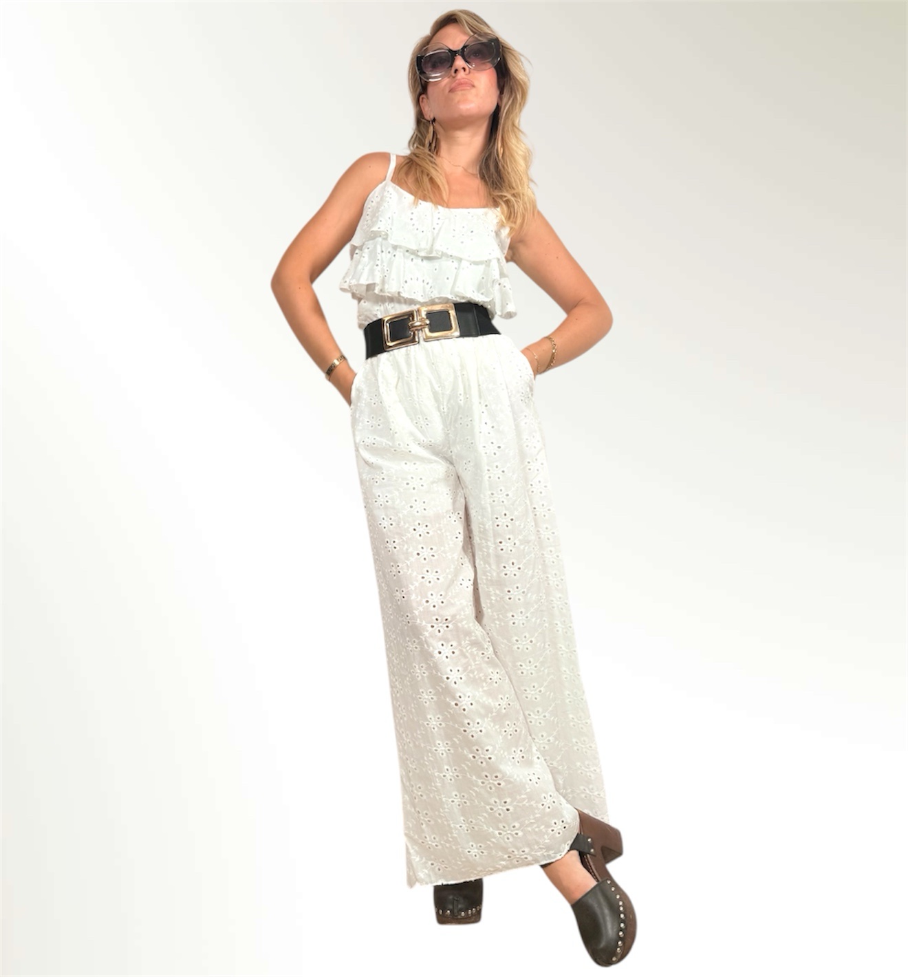 Pantalone 100% cotone in sangallo con elastico in vita e vestibilitá morbida.