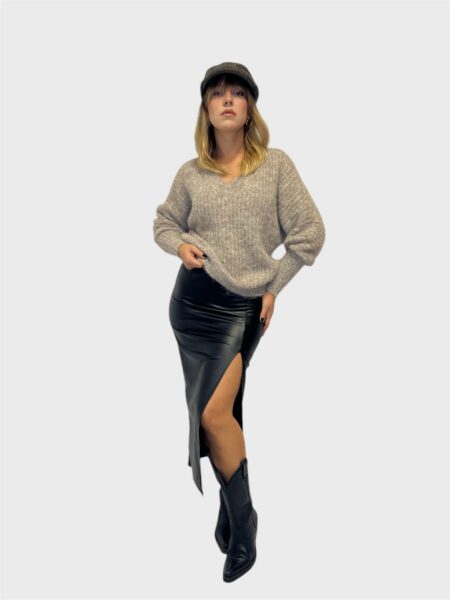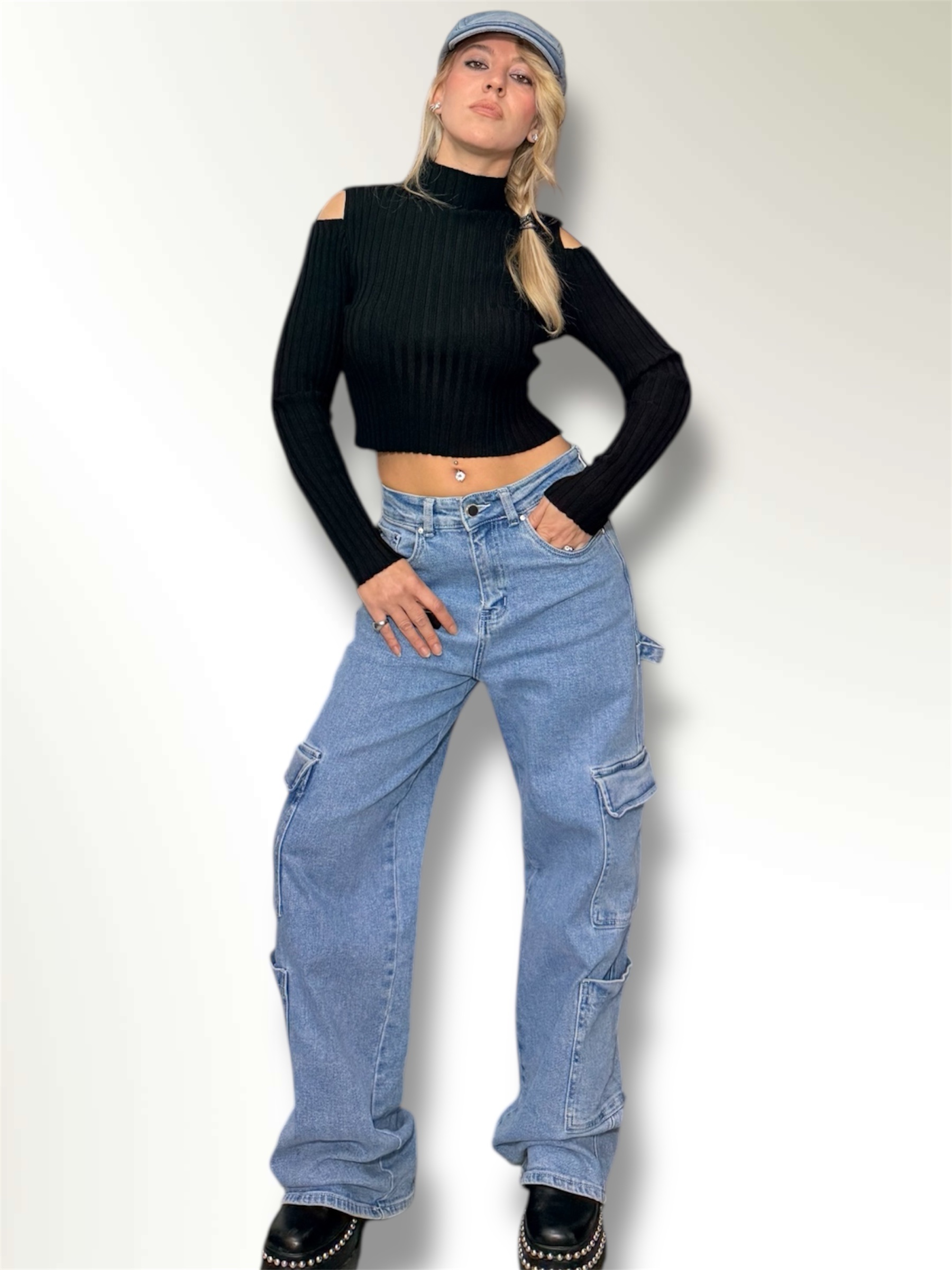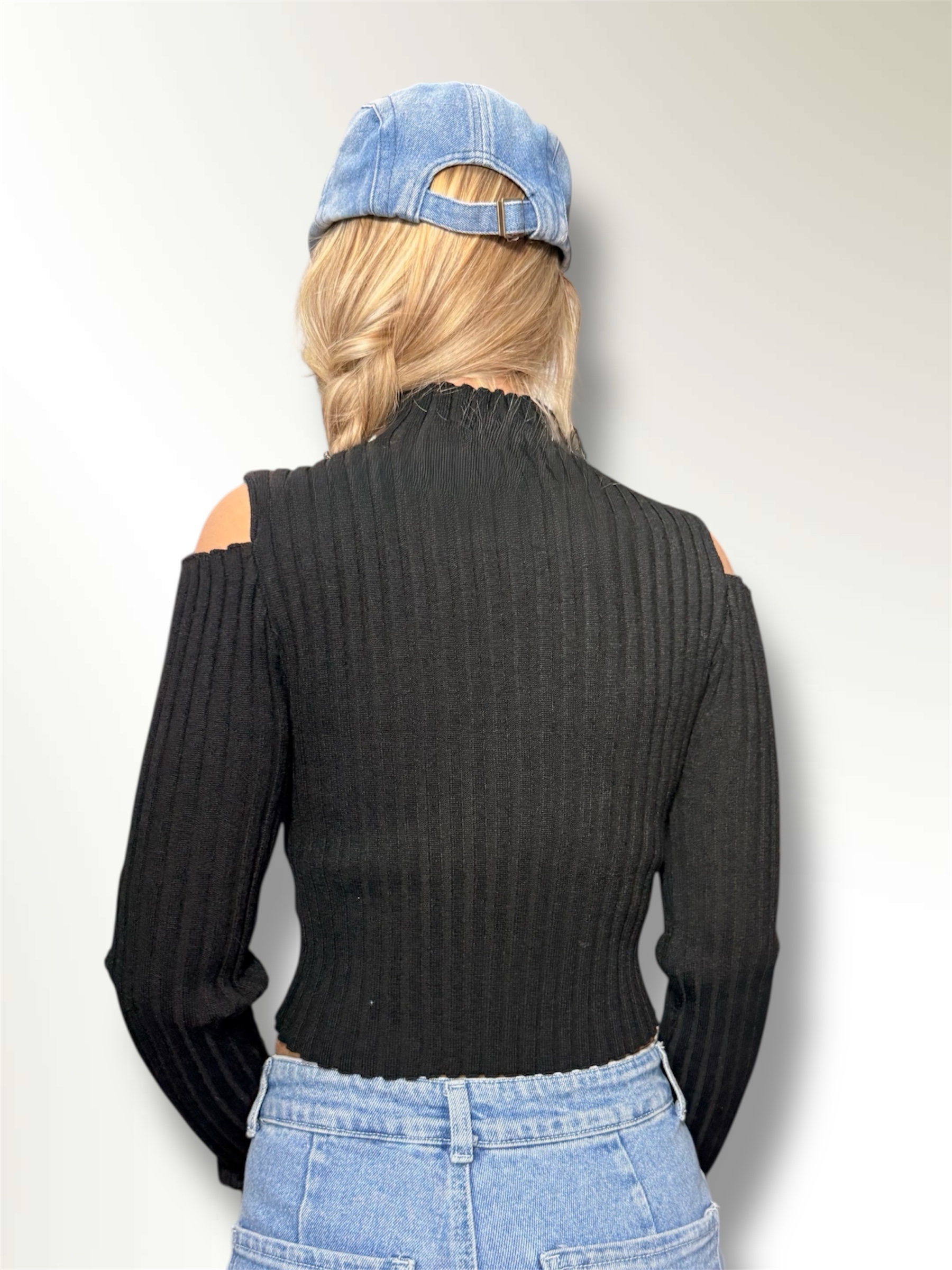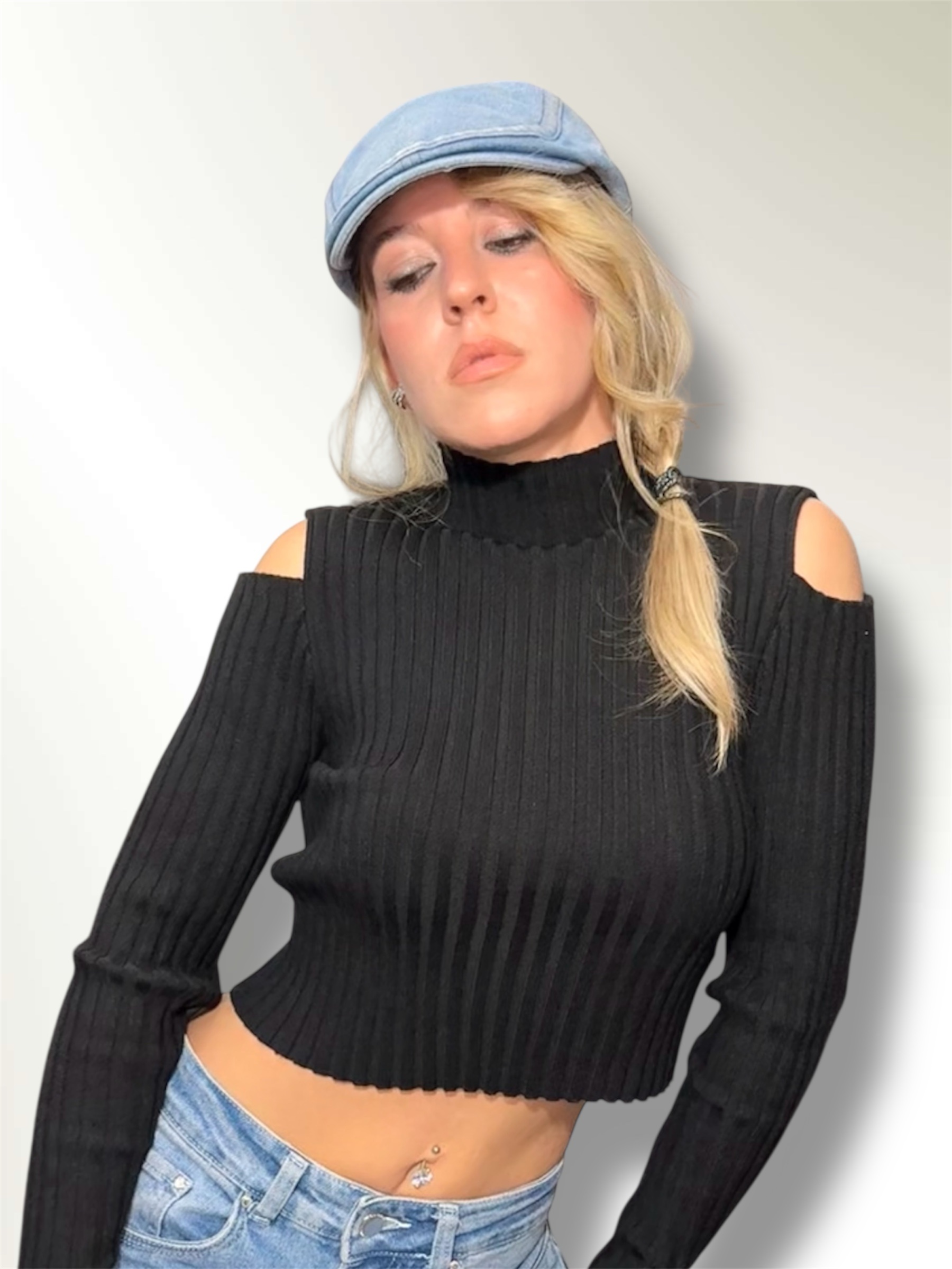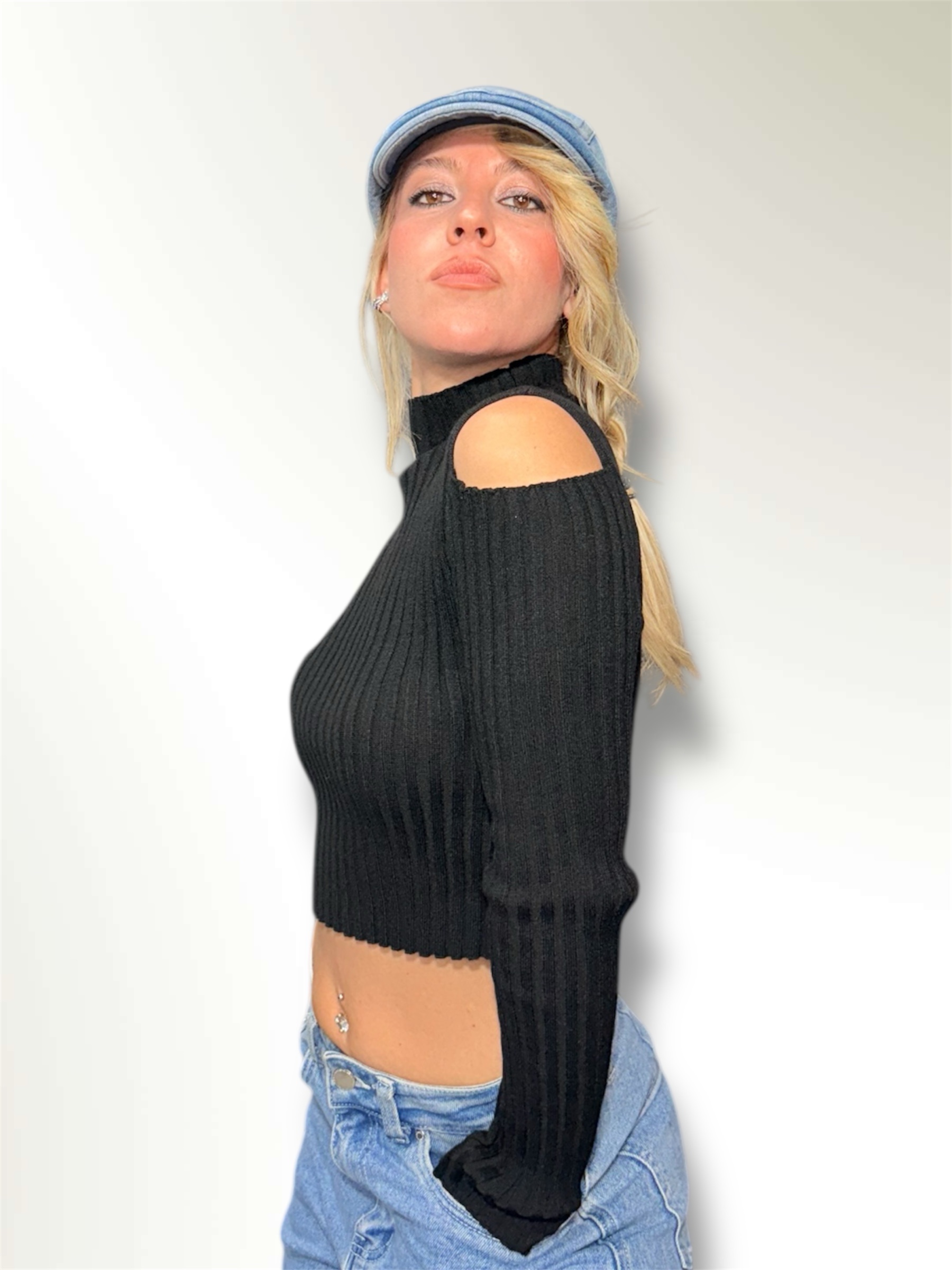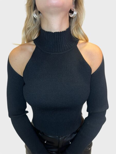Maglia dolcevita a costine con dettaglio sulla manica,spalle scoperte.