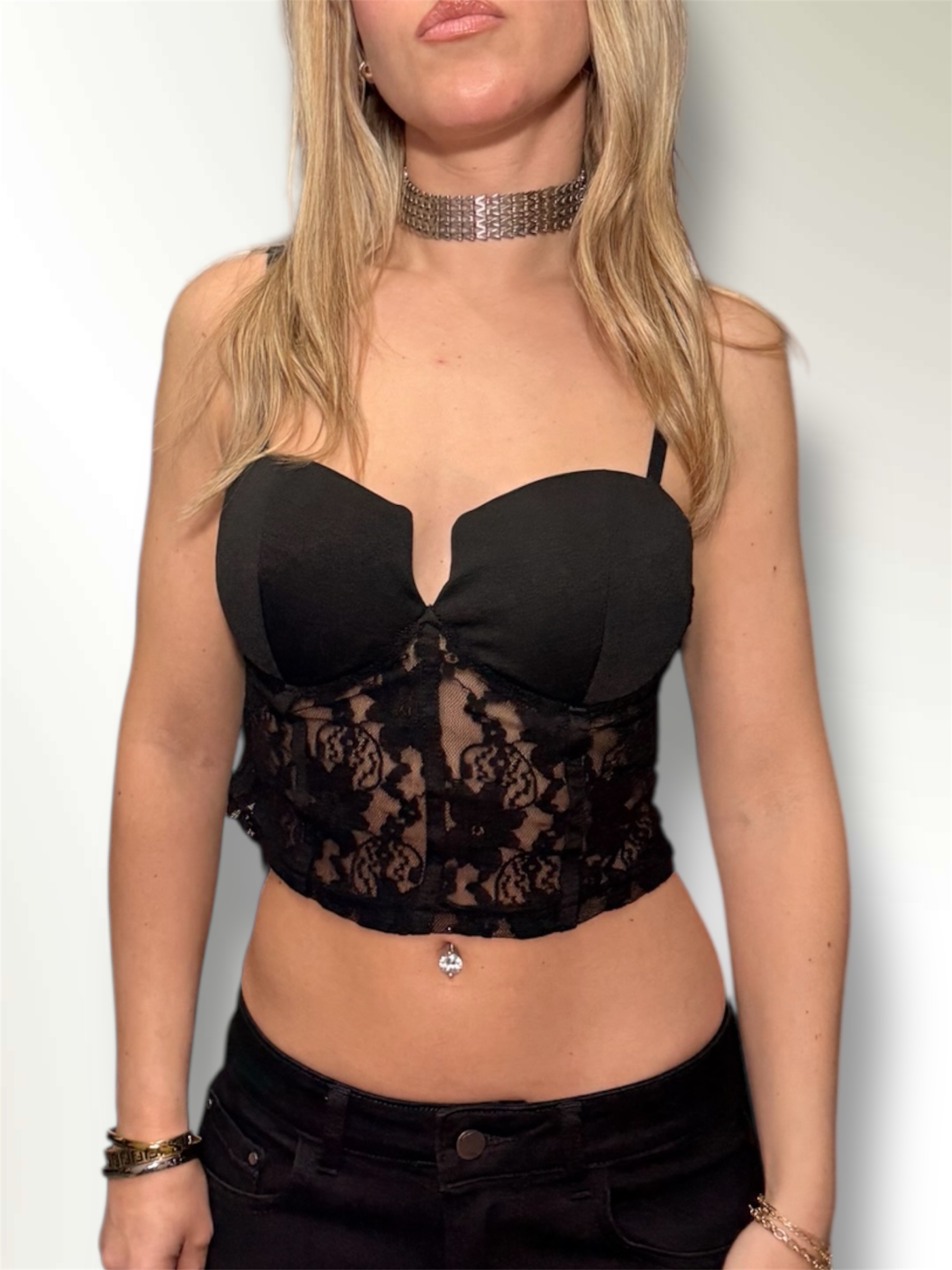 Top nero corto in pizzo con spalline regolabili e coppe rigide(fino a una quarta di seno).